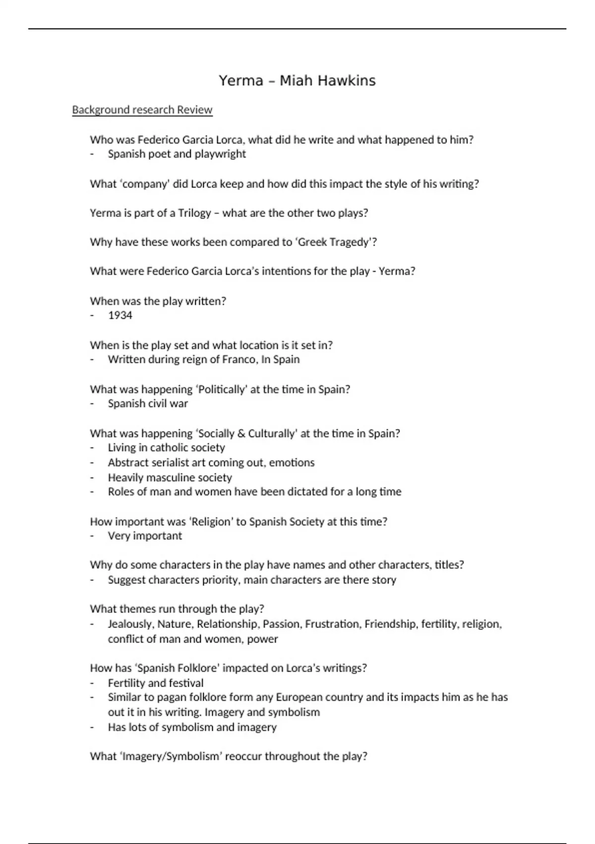 What were Federico Garcia Lorca’s intentions for the play - Yerma?