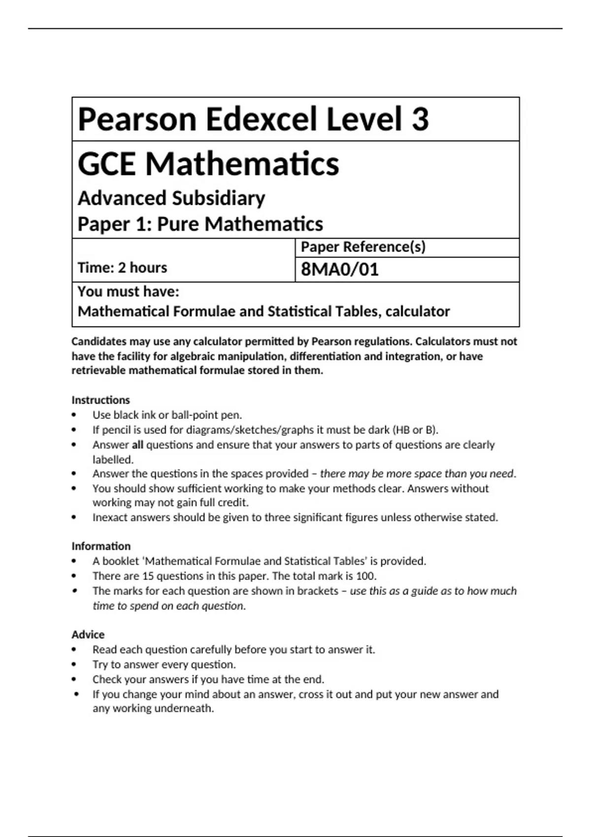 Pearson Edexcel Level 3 GCE Mathematics Advanced Subsidiary Paper 1: Pure Mathematics Time: 2 hours Paper Reference(s) 8MA0/01 You must have: Mathematical Formulae and Statistical Tables, calculator Candidates may use any calculator permitted by Pearson regulations. Calculators must not have the facility for algebraic manipulation, differentiation and integration, or have retrievable mathematical formulae stored in them. Instructions • Use black ink or ball-point pen. • If pencil is used for diagrams/sketches/graphs it must be dark (HB or B). • Answer all questions and ensure that your answers to parts of questions are clearly labelled. • Answer the questions in the spaces provided – there may be more space than you need. • You should show sufficient working to make your methods clear. Answers without working may not gain full credit. • Inexact answers should be given to three significant figures unless otherwise stated. Information • A booklet ‘Mathematical Formulae and Statistical Tables’ is provided. • There are 15 questions in this paper. The total mark is 100. • The marks for each question are shown in brackets – use this as a guide as to how much time to spend on each question. Advice • Read each question carefully before you start to answer it. • Try to answer every question. • Check your answers if you have time at the end. • If you change your mind about an answer, cross it out and put your new answer and any working underneath. Answer ALL questions. Write your answers in the spaces provided. 1. Find 1 ∫( 2