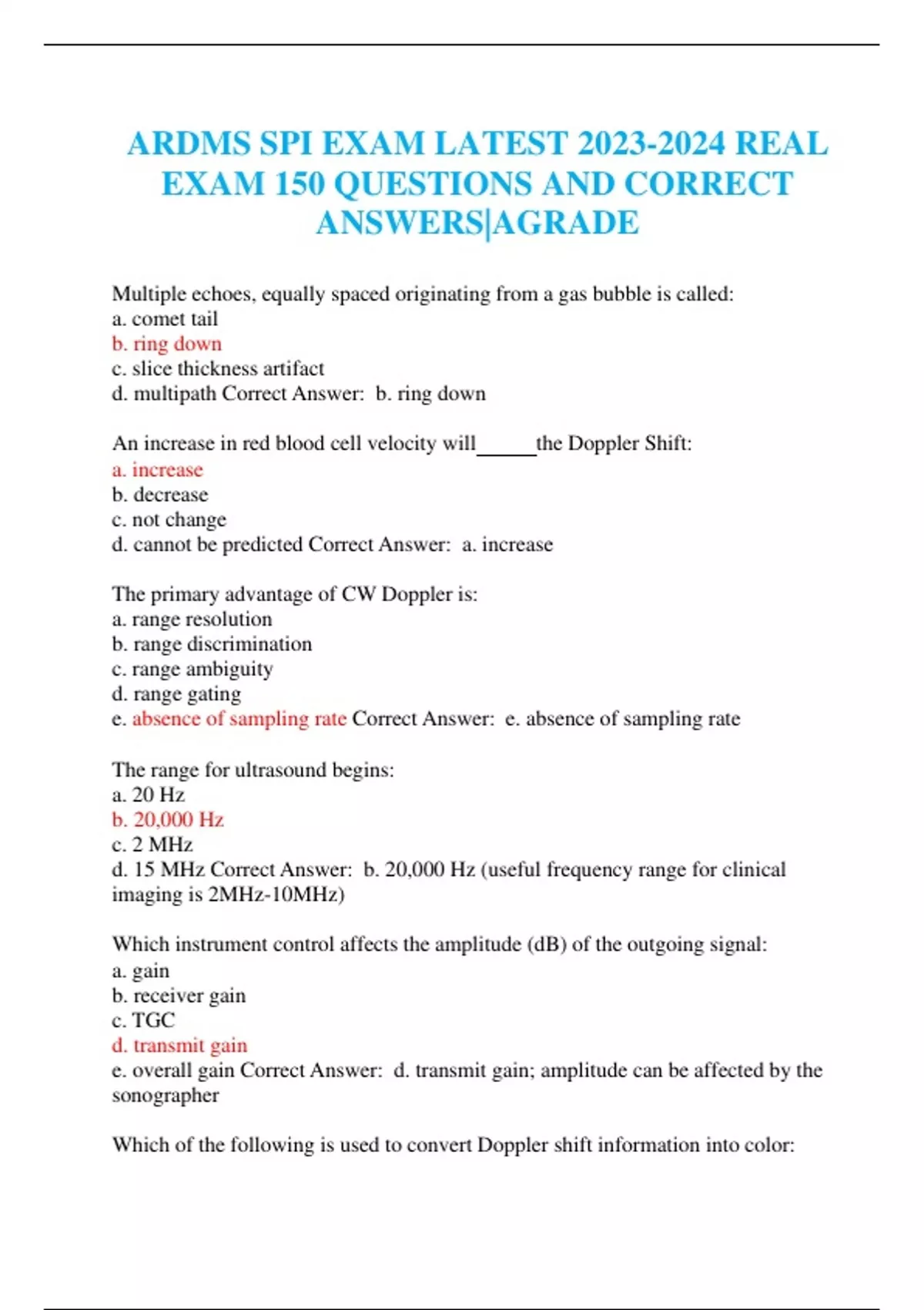 Multiple echoes, equally spaced originating from a gas bubble is called: a. comet tail b. ring down c. slice thickness artifact d. multipath Correct Answer: b. ring down An increase in red blood cell velocity will the Doppler Shift: a. increase b. decrease c. not change d. cannot be predicted Correct Answer: a. increase The primary advantage of CW Doppler is: a. range resolution b. range discrimination c. range ambiguity d. range gating e. absence of sampling rate Correct Answer: e. absence of sampling rate The range for ultrasound begins: a. 20 Hz b. 20,000 Hz c. 2 MHz d. 15 MHz Correct Answer: b. 20,000 Hz (useful frequency range for clinical imaging is 2MHz-10MHz) Which instrument control affects the amplitude (dB) of the outgoing signal: a. gain b