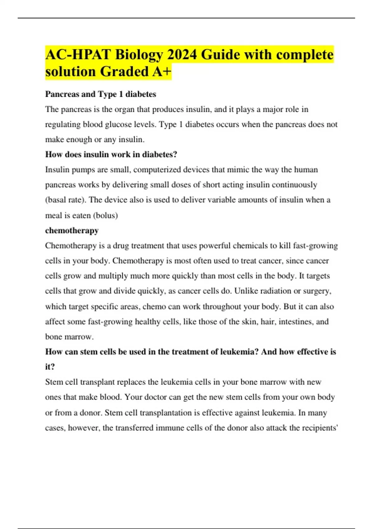 AC-HPAT Biology 2024 Guide with complete solution Graded A+ Pancreas and Type 1 diabetes The pancreas is the organ that produces insulin, and it plays a major role in regulating blood glucose levels. Type 1 diabetes occurs when the pancreas does not make enough or any insulin. How does insulin work in diabetes? Insulin pumps are small, computerized devices that mimic the way the human pancreas works by delivering small doses of short acting insulin continuously (basal rate). The device also is used to deliver variable amounts of insulin when a meal is eaten (bolus) chemotherapy Chemotherapy is a drug treatment that uses powerful chemicals to kill fast-growing cells in your body. Chemotherapy is most often used to treat cancer, since cancer cells grow and multiply much more quickly than most cells in the body. It targets cells that grow and divide quickly, as cancer cells do. Unlike radiation or surgery, which target specific areas, chemo can work throughout your body. But it can also affect some fast-growing healthy cells, like those of the skin, hair, intestines, and bone marrow. How can stem cells be used in the treatment of leukemia? And how effective is it? Stem cell transplant replaces the leukemia cells in your bone marrow with new ones that make blood. Your doctor can get the new stem cells from your own body or from a donor. Stem cell transplantation is effective against leukemia. In many cases, however, the transferred immune cells of the donor also attack the recipients' healthy tissue—often with fatal consequences. ... Stem cell therapy offers people suffering from leukemia or bone-marrow cancer the chance of full recovery. Why is laser technology more effective than conventional surgery in removing cancerous tumours? Lasers are more precise than standard surgical tools (scalpels), so they do less damage to normal tissues. As a result, patients usually have less pain, bleeding, swelling, and scarring. With laser therapy, operations are usually shorter. Urinary system · The urinary system, also known as the renal system or urinary tract, consists of the kidneys, ureters, bladder, and the urethra. The purpose of the urinary system is to eliminate waste from the body, regulate blood volume and blood pressure, control levels of electrolytes and metabolites, and regulate blood pH Nanotechnology Nanotechnology can provide rapid and sensitive detection of cancer-related molecules, enabling scientists to detect molecular changes even when they occur only in a small percentage of cells. Mercury poisoning The most common cause of mercury poisoning is from consuming too much methyl mercury or organic mercury, which is linked to eating seafood. Small amounts of mercury are present in everyday foods and products, which may not affect your health. Too much mercury, however, can be poisonous. Mercury salts affect primarily the gastrointestinal tract and the kidneys, and can cause severe kidney damage; however, as they cannot cross the blood-brain barrier easily, these salts inflict little neurological damage without continuous or heavy exposure. How can ultraviolet light from the sun affect the cells of the human eye? UV rays may lead to macular degeneration, a leading cause of vision loss for older Americans. UV rays, especially UV-B rays, may also cause some kinds of cataracts. A cataract is a clouding of the eye's natural lens, the part of the eye that focuses the light we see. Macromolecules Macromolecules are large molecules composed of thousands of covalently connected atoms. Carbohydrates, lipids, proteins, and nucleic acids are all macromolecules. Macromolecules are formed by many monomers linking together, forming a polymer. passive transport