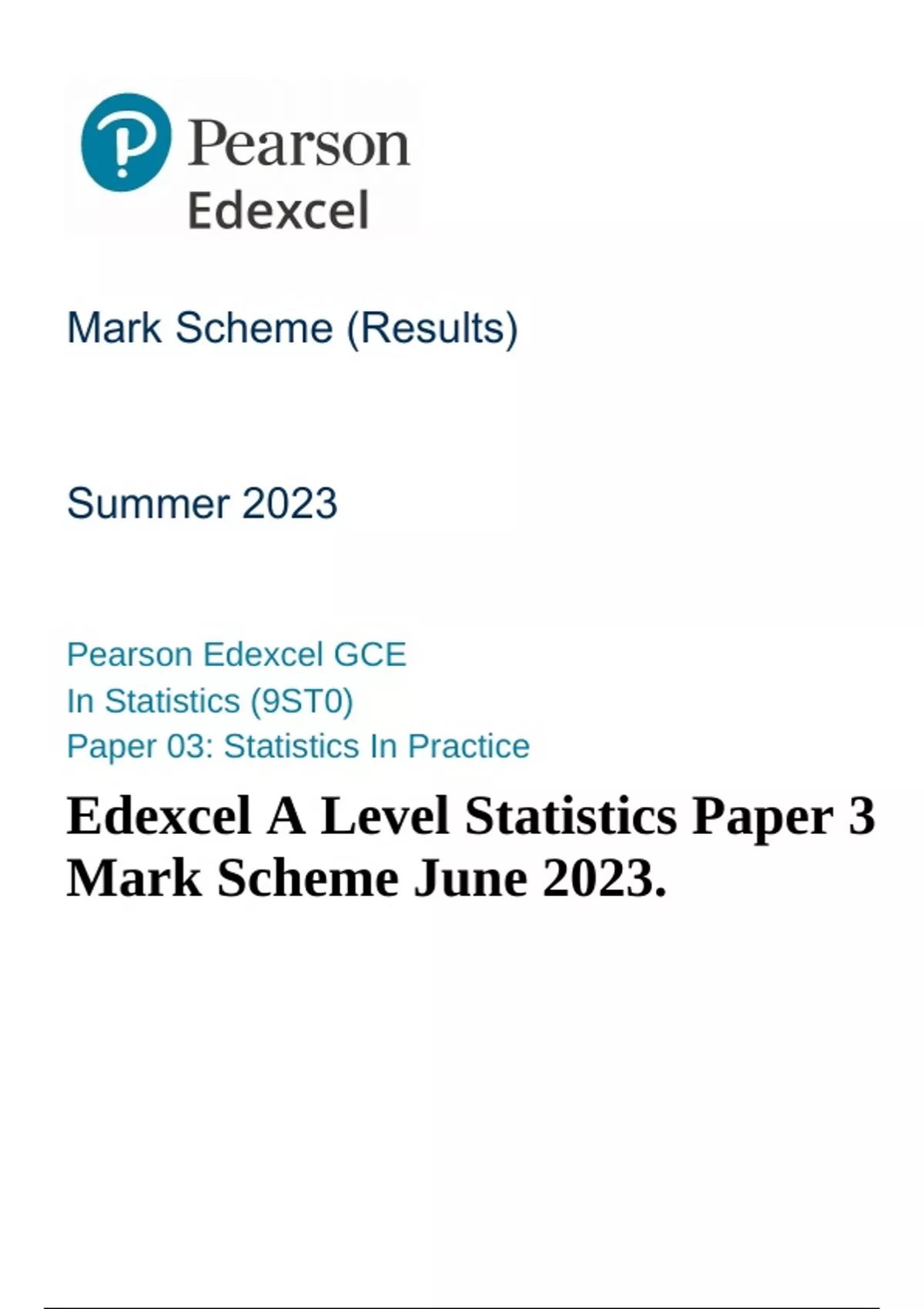 Edexcel A Level Statistics Paper 3 Mark Scheme June 2023.