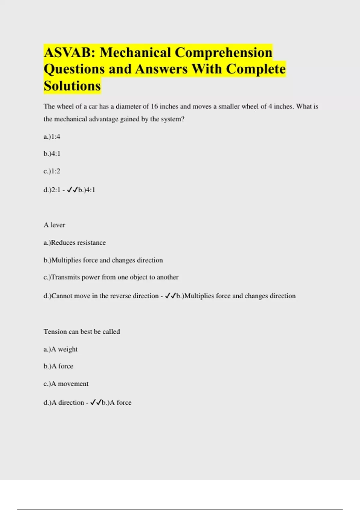 ASVAB: Mechanical Comprehension Questions and Answers With Complete Solutions