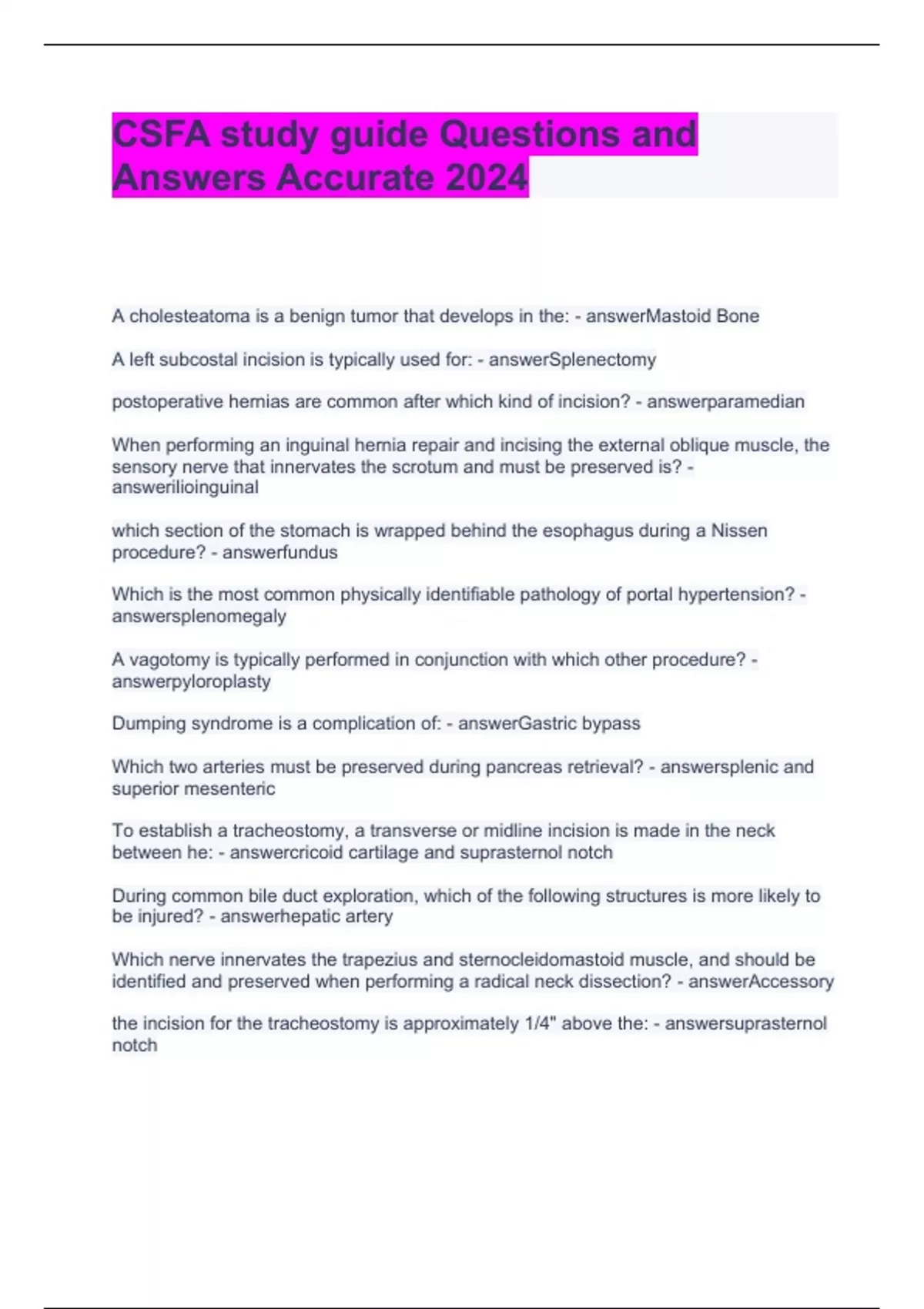 CSFA study guide Questions and Answers Accurate 2024 A cholesteatoma is a benign tumor that develops in the: Mastoid Bone A left subcostal incision is typically used for: Splenectomy Brainpower Read More Previous Play Next Rewind 10 seconds Move forward 10 seconds Unmute 0:08 / 0:15 Full screen postoperative hernias are common after which kind of incision? paramedian When performing an inguinal hernia repair and incising the external oblique muscle, the sensory nerve that innervates the scrotum and must be preserved is? ilioinguinal which section of the stomach is wrapped behind the esophagus during a Nissen procedure? fundus Which is the most common physically identifiable pathology of portal hypertension? splenomegaly A vagotomy is typically performed in conjunction with which other procedure? pyloroplasty Dumping syndrome is a complication of: Gastric bypass Which two arteries must be preserved during pancreas retrieval? splenic and superior mesenteric To establish a tracheostomy, a transverse or midline incision is made in the neck between he: cricoid cartilage and suprasternol notch During common bile duct exploration, which of the following structures is more likely to be injured? hepatic artery Which nerve innervates the trapezius and sternocleidomastoid muscle, and should be identified and preserved when performing a radical neck dissection? Accessory the incision for the tracheostomy is approximately 1/4" above the: suprasternol notch In order to preserve the hepatic artery during liver and pancreas procurement, which branch artery must be identified and ligated? Gastroduodenal Zenkers diverticulum is an outpouching of the? esophagus Which hernia is typically the result of postoperative wound dehiscense? incisional