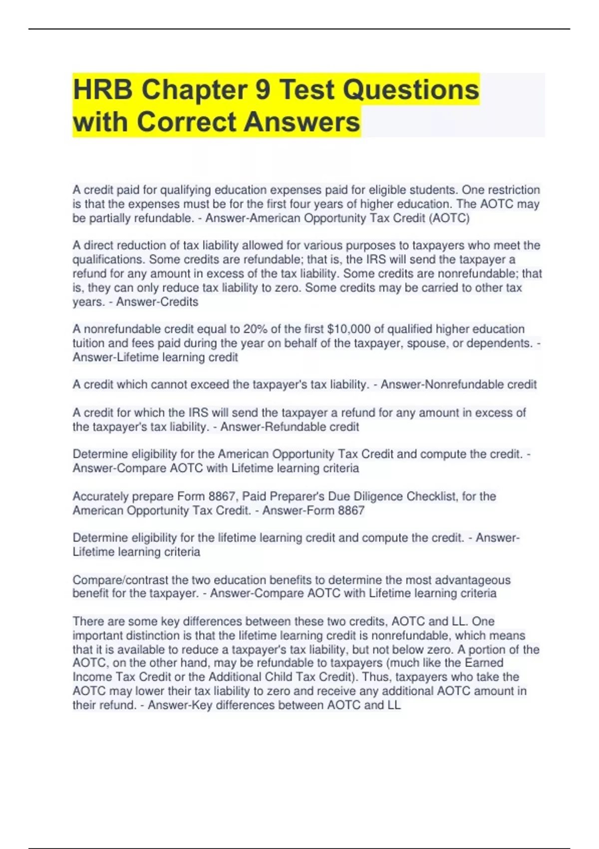 HRB Chapter 9 Test Questions with Correct Answers A credit paid for qualifying education expenses paid for eligible students. One restriction is that the expenses must be for the first four years of higher education. The AOTC may be partially refundable. - Answer-American Opportunity Tax Credit (AOTC) A direct reduction of tax liability allowed for various purposes to taxpayers who meet the qualifications. Some credits are refundable; that is, the IRS will send the taxpayer a refund for any amount in excess of the tax liability. Some credits are nonrefundable; that is, they can only reduce tax liability to zero. Some credits may be carried to other tax years. - Answer-Credits A nonrefundable credit equal to 20% of the first $10,000 of qualified higher education tuition and fees paid during the year on behalf of the taxpayer, spouse, or dependents. - Answer-Lifetime learning credit A credit which cannot exceed the taxpayer's tax liability. - Answer-Nonrefundable credit A credit for which the IRS will send the taxpayer a refund for any amount in excess of the taxpayer's tax liability. - Answer-Refundable credit Determine eligibility for the American Opportunity Tax Credit and compute the credit. - Answer-Compare AOTC with Lifetime learning criteria Accurately prepare Form 8867, Paid Preparer's Due Diligence Checklist, for the American Opportunity Tax Credit. - Answer-Form 8867 Determine eligibility for the lifetime learning credit and compute the credit. - Answer-Lifetime learning criteria Compare/contrast the two education benefits to determine the most advantageous benefit for the taxpayer. - Answer-Compare AOTC with Lifetime learning criteria There are some key differences between these two credits, AOTC and LL. One important distinction is that the lifetime learning credit is nonrefundable, which means that it is available to reduce a taxpayer's tax liability, but not below zero. A portion of the AOTC, on the other hand, may be refundable to taxpayers (much like the Earned Income Tax Credit or the Additional Child Tax Credit). Thus, taxpayers who take the AOTC may lower their tax liability to zero and receive any additional AOTC amount in their refund. - Answer-Key differences between AOTC and LL