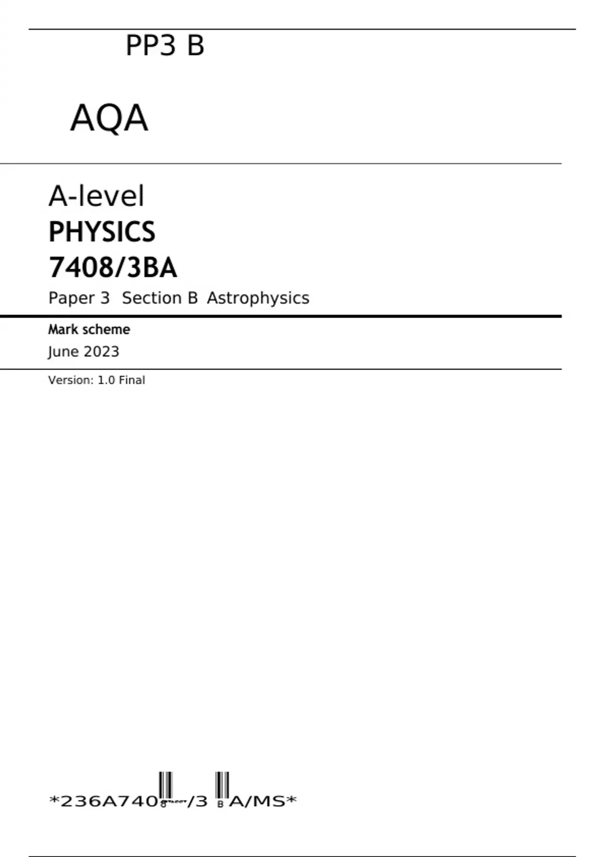 AQA A-level PHYSICS 7408/3BA Paper 3 Section B JUNE 2023 > FINAL MARK SCHEME Astrophysics