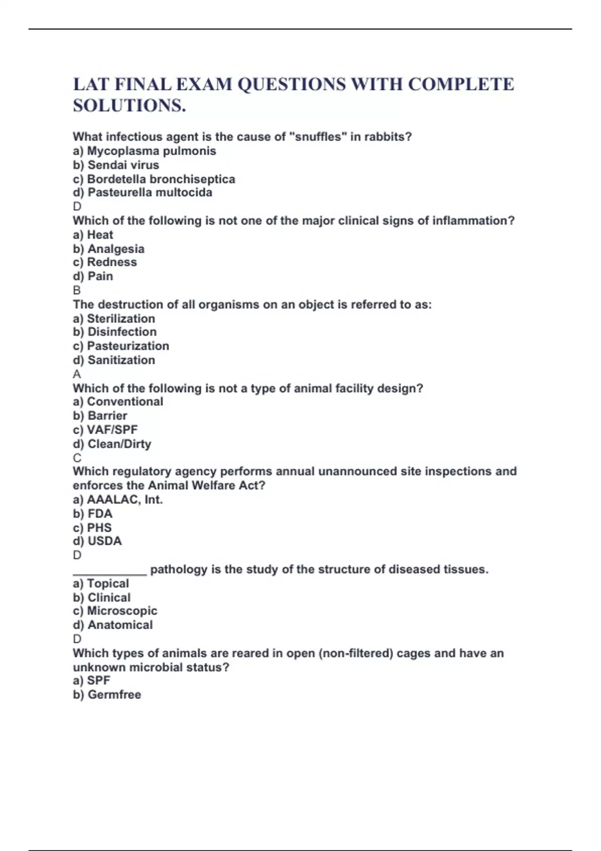 LAT FINAL EXAM QUESTIONS WITH COMPLETE SOLUTIONS. What infectious agent is the cause of "snuffles" in rabbits? a) Mycoplasma pulmonis b) Sendai virus c) Bordetella bronchiseptica d) Pasteurella multocida D Which of the following is not one of the major clinical signs of inflammation? a) Heat b) Analgesia c) Redness d) Pain B The destruction of all organisms on an object is referred to as: a) Sterilization b) Disinfection c) Pasteurization d) Sanitization A Which of the following is not a type of animal facility design? a) Conventional b) Barrier c) VAF/SPF d) Clean/Dirty C Which regulatory agency performs annual unannounced site inspections and enforces the Animal Welfare Act? a) AAALAC, Int. b) FDA c) PHS d) USDA D ___________ pathology is the study of the structure of diseased tissues. a) Topical b) Clinical c) Microscopic d) Anatomical D Which types of animals are reared in open (non-filtered) cages and have an unknown microbial status? a) SPF b) Germfree c) Gnotobiotic d) Conventional D Which of the following warm-blooded vertebrates is not regulated by the Animal Welfare Act? a) Horses used for antibody production b) Sheep used in open heart surgery research c) Pigeons used for behavioral testing d) Wild rats used for viral infection C ___________ is the science of poisons and the harmful or noxious effects these substances have on living organisms. a) Histology b) Botany c) Pathology d) Toxicology D If an animal dies spontaneously, changes in the tissues begin to occur as the body decomposes. This process is called autolysis. What is the best way to preserve tissues for a diagnostic necropsy? a) Place the dead animal in a freezer b) Place the animal in an autoclave c) Place the animal in a refrigerator d) Leave the animal in the exact location where it died C What is the term used to describe the study of birth defects? a) Teratology b) Gynecology c) Obstetrics d) Mutitology A The written document that an investigator must complete, and submit to their Institutional Animal Care and Use Committee, if they plan to use animals in research is called the ___________________. a) Animal use protocol b) Animal use grant c) Research use protocol d) Research use grant A How long can bacteria survive when kept in the transport media of a sterile swab? a) 24 hrs. b) 48 hrs. c) 72 hrs. d) 96 hrs. A The word, "hypothyroidism", has the prefix _____, the suffix ________, and the root __________. a) ism; hypo; thyroid b) hypo; ism; thyroid c) thyroid; hypo; ism d) hypo; thyroid; ism B A beagle is euthanized in May 1999. How long must the animal facility retain the USDA identification tags (if used) on the animal for possible review by the USDA? a) 6 months b) 12 months c) 24 months d) 36 months B The process which reduces the number of pathogenic organisms on an object to a harmless level is known as: a) Disinfection b) Sanitization c) Sterilization d) Pasteurization A Special glass tubes are used to collect blood samples, these tubes have different colored rubber stoppers to indicate which anticoagulant, if any, is in the tube. Which of the following colors is used to indicate EDTA is in the glass tube? a) Blue b) Red c) Purple d) Green C Blood chemistry tests are performed on blood, plasma, or serum to help diagnose abnormal conditions or illness in animals and humans. Which of the following tests can be used to determine abnormal liver function? a) ALT & AST b) BUN & Creatinine c) CPK & Na d) Amylase & Lipase A What is the name of the committee made up of scientists and nonscientists that reviews animal use protocols, inspects the animal facility, and monitors experimental procedures in which animals are used? a) OPRR b) OSHA c) ACUP d) IACUC D What is the name of the voluntary accreditation organization that inspects and accredits animal care programs? a) USDA b) FDA c) AAALAC, Int. d) PHS C What term is used to describe the breakdown or splitting open of a surgical incision? a) Herniation b) Prolapse c) Evisceration d) Dehiscence D Neonatal (newborn) animals require _________ exposure to carbon dioxide to cause death compared to adult animals. a) No b) Longer c) Shorter d) Same B Which of the following is the correct formula for the conversion of Fahrenheit degrees to Celsius degrees? a) F=5/9 (C-32) b) C=5/9 (F-32) c) F=9/5 (C-32) d) C=9/5 (F-32) B If the cagewash temperature is 210 F. What is this temperature on the Celsius scale? a) 25 C b) 54 C c) 82 C d) 99 C D _____________ is the process by which the number of bacteria and other organisms living on inanimate objects is reduced enough to prevent disease. a) Disinfection b) Sanitization c) Sterilization d) Pasteurization B Which of the following are considered types of acute toxicity tests? a) FETAX & Lymphocytes assay b) LD50 & Draize test c) LAL assay & LD50 d) In vitro micronucleus & Guinea pig dermal test B An animal room, which uses special cages and procedures such as autoclaved food, bedding, and caging, is considered what type of animal room? a) Conventional b) Gnotobiotic c) Barrier d) Specific pathogen-free (SPF) C A _______________ toxicity test varies from 13-26 weeks in duration and usually involves rodents or dogs. The animals are dosed on a daily basis in a similar manner that may be administered to humans. a) Subacute b) Subchronic c) Acute d) Chronic B What does the acronymn PCR stand for? a) Polymerase chain reaction b) Polychromatic reticulocytes c) Packed clotted red blood cells d) Polyallelic canine retinopathy A The anatomical term "dorsal" means "towards the __________________." a) Abdomen b) Back c) Head d) Rear B What color is air in the lungs of a normal animal on a radiograph (x-ray)? a) White b) Gray c) Black d) Blue C What does the term specific pathogen-free indicate? a) Animals do not have any diseases b) Animals are born without any bacteria or viruses c) Animals do not have certain diseases which normally infects the species d) Animals do not have any pathogens of any kind C A barrier animal facility has s