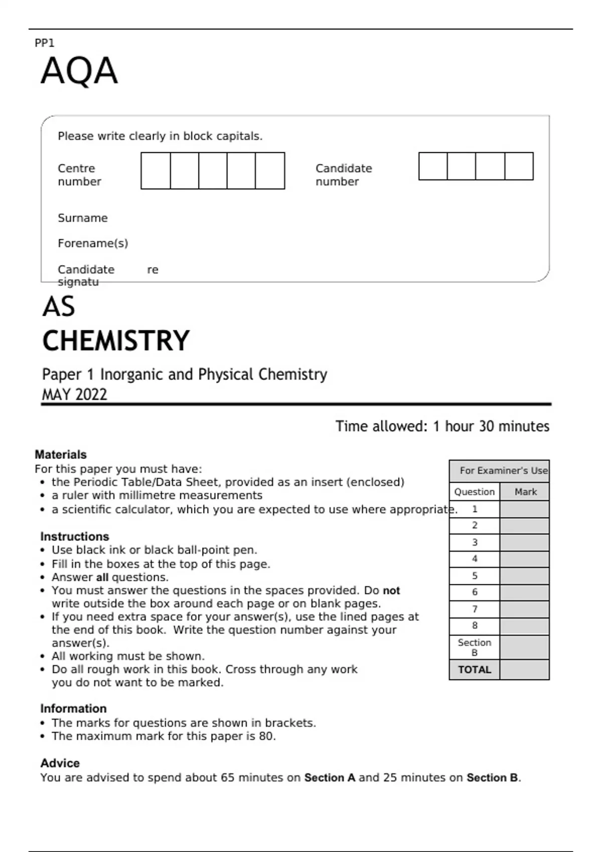 AQA AS LEVEL CHEMISTRY Paper 1 MAY 2022 FINAL QUESTION PAPER Inorganic and Physical Chemistry