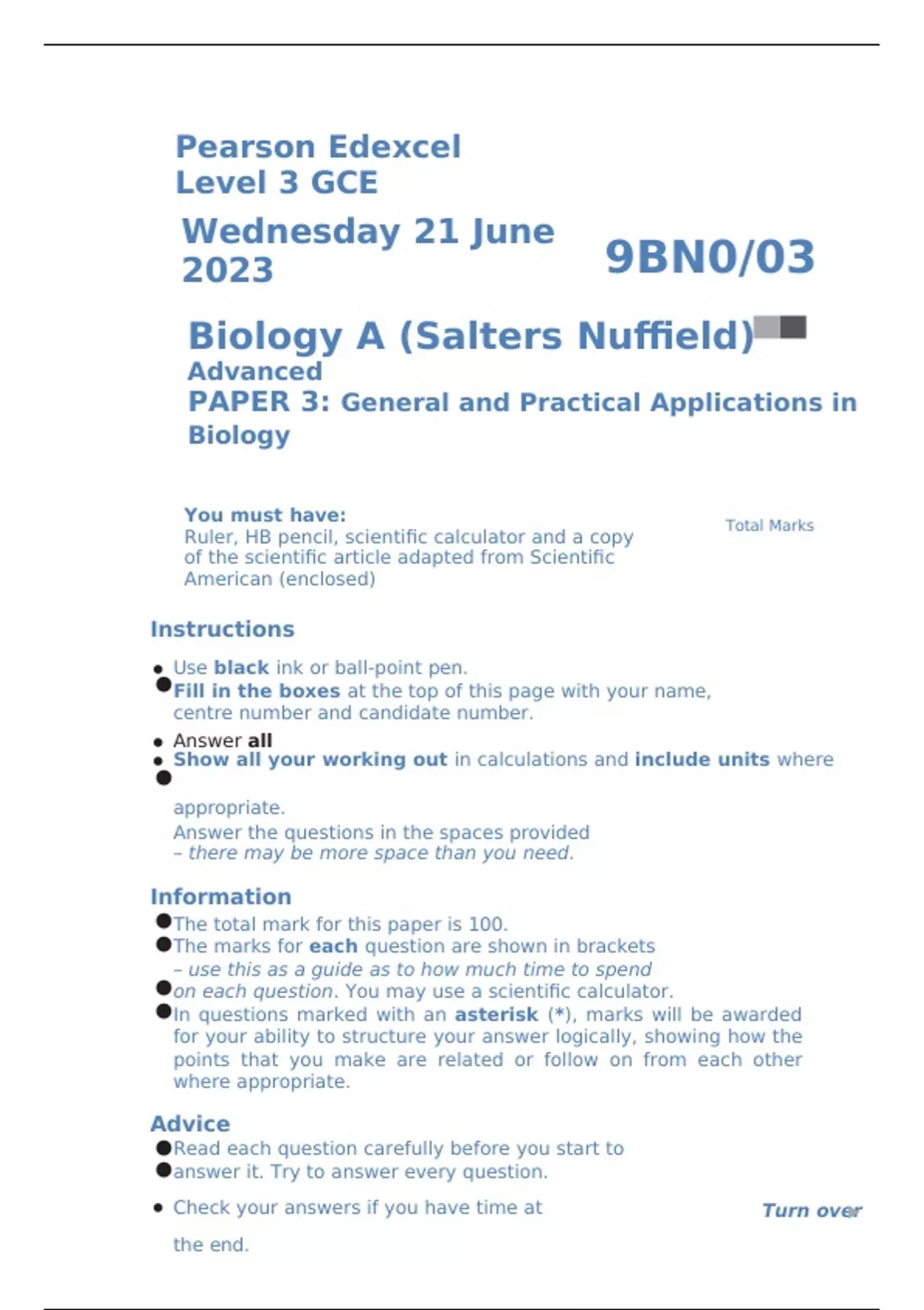 Pearson Edexcel Level 3 GCE June 2023 9BN0/03 Biology A Advanced PAPER 3: General and Practical Applications in Biology June 2023