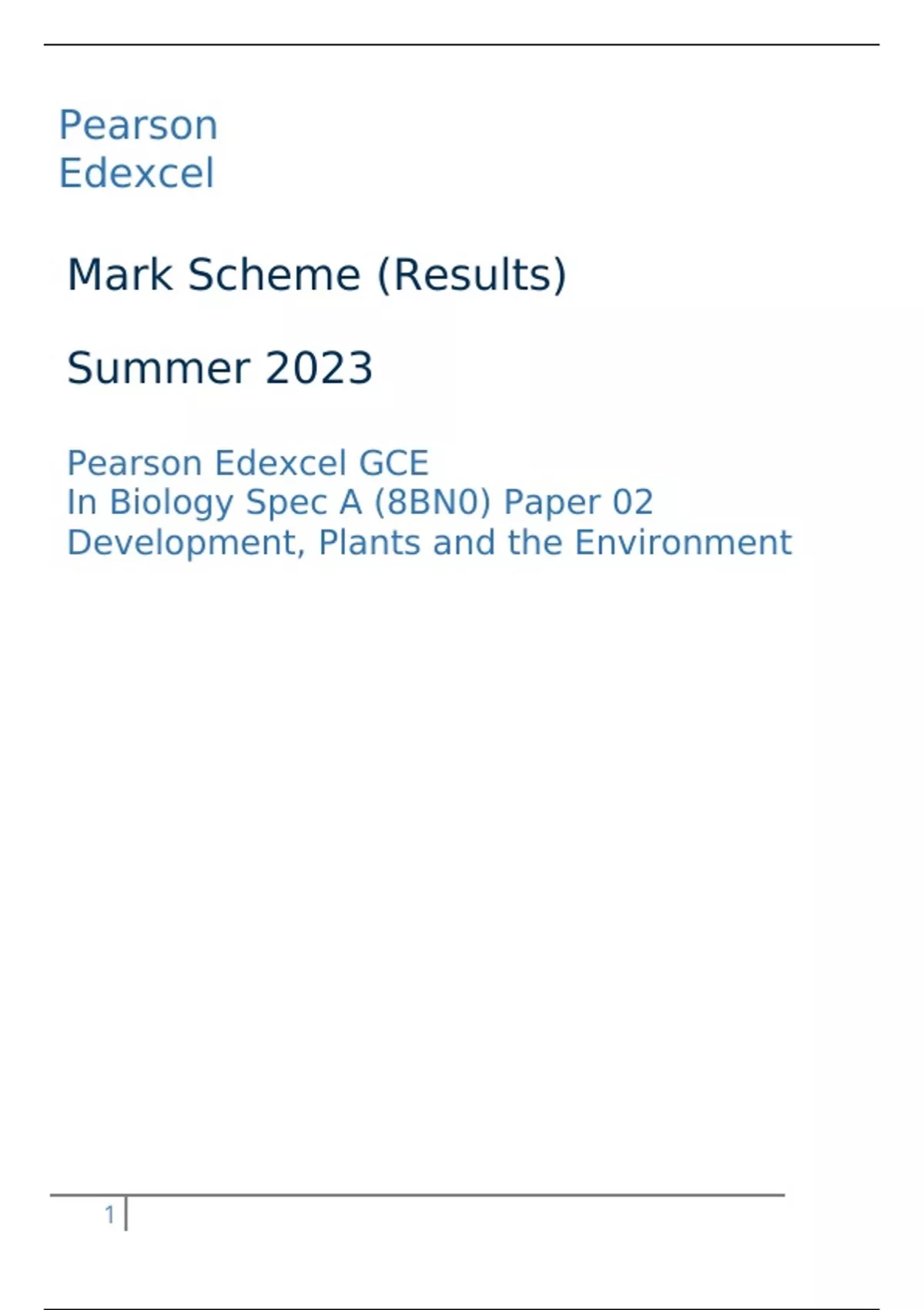 Pearson Edexcel GCE In Biology Spec A (8BN0) Paper 02 Development, Plants and the Environment Mark Scheme Summer 2023