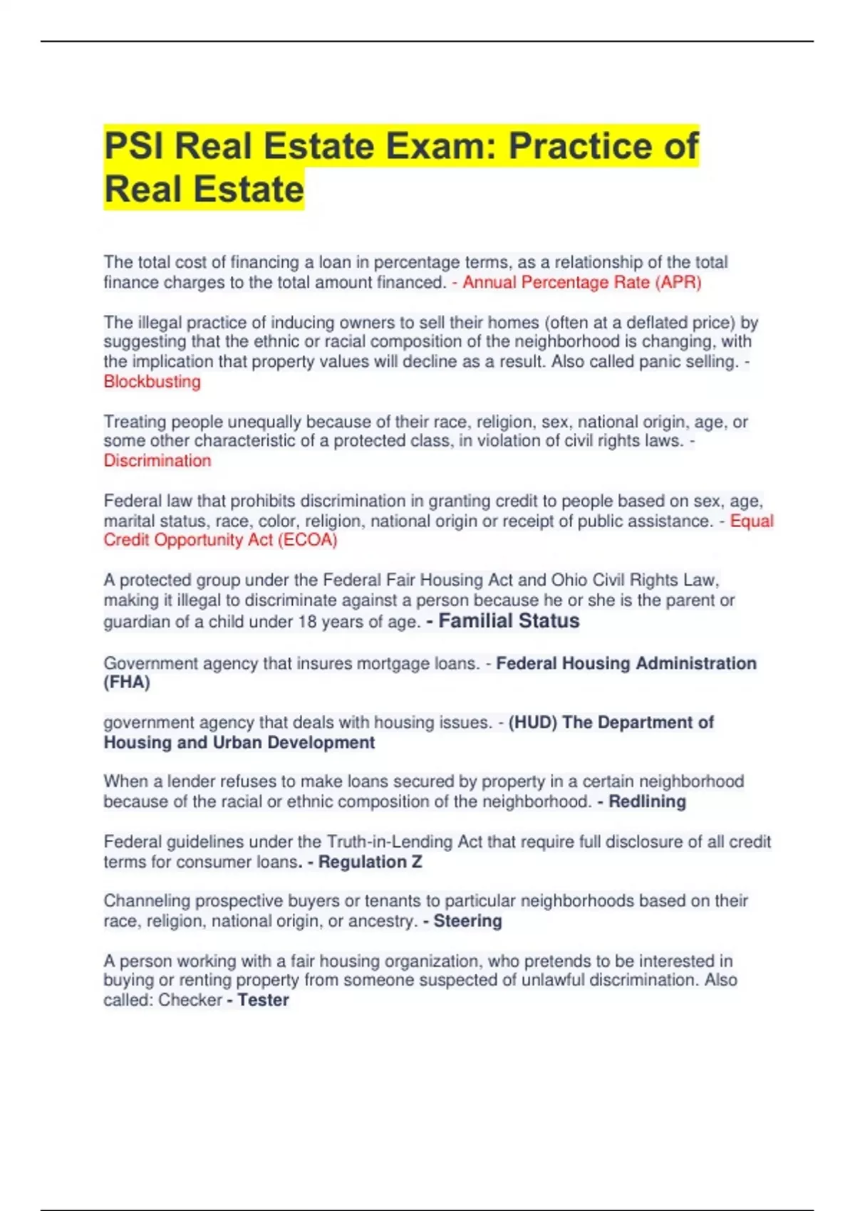 PSI Real Estate Exam: Practice of Real Estate The total cost of financing a loan in percentage terms, as a relationship of the total finance charges to the total amount financed. - Annual Percentage Rate (APR) The illegal practice of inducing owners to sell their homes (often at a deflated price) by suggesting that the ethnic or racial composition of the neighborhood is changing, with the implication that property values will decline as a result. Also called panic selling. - Blockbusting Treating people unequally because of their race, religion, sex, national origin, age, or some other characteristic of a protected class, in violation of civil rights laws. - Discrimination Federal law that prohibits discrimination in granting credit to people based on sex, age, marital status, race, color, religion, national origin or receipt of public assistance. - Equal Credit Opportunity Act (ECOA) A protected group under the Federal Fair Housing Act and Ohio Civil Rights Law, making it illegal to discriminate against a person because he or she is the parent or guardian of a child under 18 years of age. - Familial Status Government agency that insures mortgage loans. - Federal Housing Administration (FHA) government agency that deals with housing issues. - (HUD) The Department of Housing and Urban Development When a lender refuses to make loans secured by property in a certain neighborhood because of the racial or ethnic composition of the neighborhood. - Redlining Federal guidelines under the Truth-in-Lending Act that require full disclosure of all credit terms for consumer loans. - Regulation Z Channeling prospective buyers or tenants to particular neighborhoods based on their race, religion, national origin, or ancestry. - Steering A person working with a fair housing organization, who pretends to be interested in buying or renting property from someone suspected of unlawful discrimination. Also called: Checker - Tester