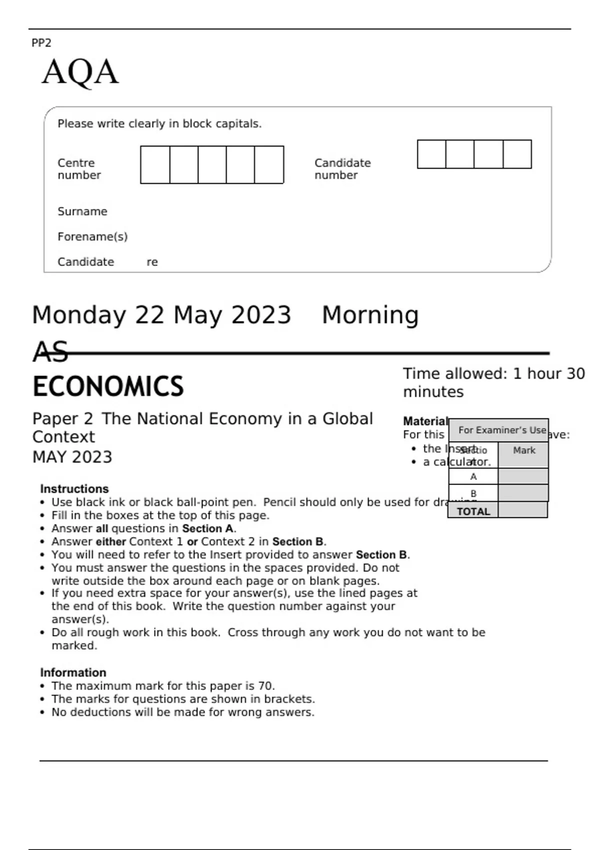 AQA AS LEVEL ECONOMICS Paper 2 MAY 2023 FINAL QQUESTION PAPER The National Economy in a Global Context
