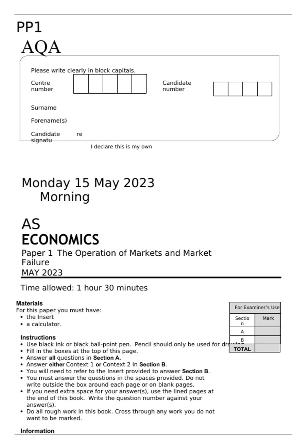 AQA AS LEVEL ECONOMICS Paper 1 MAY 2023 FINAL QUESTION PAPER The Operation of Markets and Market Failure
