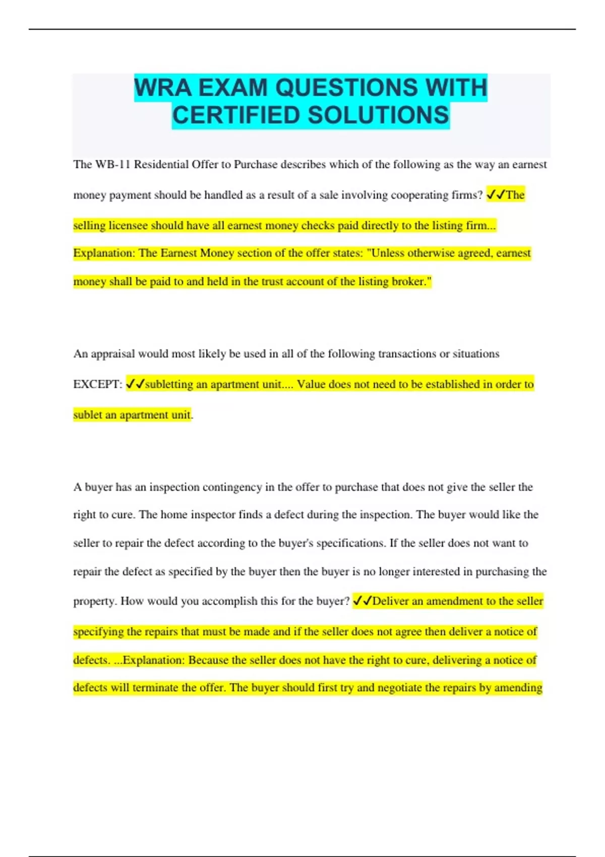 WRA EXAM QUESTIONS WITH CERTIFIED SOLUTIONS The WB-11 Residential Offer to Purchase describes which of the following as the way an earnest money payment should be handled as a result of a sale involving cooperating firms? The selling licensee should have all earnest money checks paid directly to the listing firm... Explanation: The Earnest Money section of the offer states: "Unless otherwise agreed, earnest money shall be paid to and held in the trust account of the listing broker." An appraisal would most likely be used in all of the following transactions or situations EXCEPT: subletting an apartment unit.... Value does not need to be established in order to sublet an apartment unit. A buyer has an inspection contingency in the offer to purchase that does not give the seller the right to cure. The home inspector finds a defect during the inspection. The buyer would like the seller to repair the defect according to the buyer's specifications. If the seller does not want to repair the defect as specified by the buyer then the buyer is no longer interested in purchasing the property. How would you accomplish this for the buyer? Deliver an amendment to the seller specifying the repairs that must be made and if the seller does not agree then deliver a notice of defects. ...Explanation: Because the seller does not have the right to cure, delivering a notice of defects will terminate the offer. The buyer should first try and negotiate the repairs by amending the offer. If the seller does not agree to the amendment, then issuing the notice will terminate the offer. Which of the following would violate advertising rules for real estate licensees? Advertising a property that has already been sold. ...Explanation: Wis. Admin. Code § REEB 24.04(1) states, "Licensees shall not advertise in a manner which is false, deceptive, or misleading." At closing, the seller needs to give a credit to the buyer for property taxes. Last year's taxes were $3,700 and there are 242 days from the first of the year through the day of closing. How much will the buyer's tax credit be? $2,443.02... Explanation: $3,700 / 365 day year = $10.1370 daily proration. $10.1370 x 241 days between January 1 and the day prior to closing = $2,443.02. The right of a governmental body to take ownership of real estate for public use is called: eminent domain...Explanation: Eminent domain is one form of police power and is the power of a governmental body to take ownership of real estate for a public use. Rental property is sold to a new owner. Tenants remain under a written lease. The new owner wants to raise the rent. When can the new owner raise the rent? When the lease with the current tenants expires Explanation: Unless the terms of the tenants' current lease permit an increase in rent, the new owner must wait until the lease expires and execute a new lease at the desired rent. Which of the following activities can an unlicensed personal assistant do? Schedule appointments. Explanation: An unlicensed personal assistant cannot do any activities that would require a real estate license such as showings, open houses, or completing forms. An unlicensed assistant can complete activities that do not require a license such as scheduling appointments. A city zoning board changes the zoning for a single parcel of property to meet a public need. This would be called: spot zoning...Explanation:Spot zoning occurs when a single parcel of land rezoned. A variance allows a parcel to violate permanently a zoning law. Downzoning changes the use of all the properties within a zoning district. A licensee is listing a 4-bedroom, two-story house. Which of the following would be the most suitable comparable property? A 3-bedroom, two-story house that was recently sold in the same neighborhood as the listed property. Explanation: A comparable property is a similar property currently being sold. The maximum value of a property tends to be established by value of similar properties that have recently sold. A foreclosed property does not provide a good comparison because it is not an arm's length sale. Evelyn and her boyfriend, Noah, are getting married, and are looking to purchase a new home. They have asked you as their real estate licensee for ad