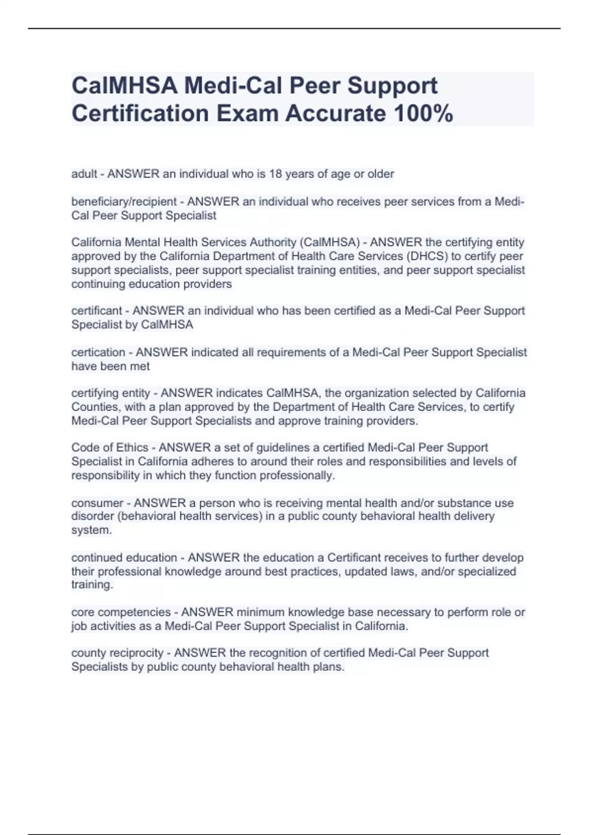 adult - ANSWER an individual who is 18 years of age or older beneficiary/recipient - ANSWER an individual who receives peer services from a Medi-Cal Peer Support Specialist California Mental Health Services Authority (CalMHSA) - ANSWER the certifying entity approved by the California Department of Health Care Services (DHCS) to certify peer support specialists, peer support specialist training entities, and peer support specialist continuing education providers certificant - ANSWER an individual who has been certified as a Medi-Cal Peer Support Specialist by CalMHSA certication - ANSWER indicated all requirements of a Medi-Cal Peer Support Specialist have been met certifying entity - ANSWER indicates CalMHSA, the organization selected by California Counties, with a plan approved by the Department of Health Care Services, to certify Medi-Cal Peer Support Specialists and approve training providers. Code of Ethics - ANSWER a set of guidelines a certified Medi-Cal Peer Support Specialist in California adheres to around their roles and responsibilities and levels of responsibility in which they function professionally. consumer - ANSWER a person who is receiving mental health and/or substance use disorder (behavioral health services) in a public county behavioral health delivery system. continued education - ANSWER the education a Certificant receives to further develop their professional knowledge around best practices, updated laws, and/or specialized training. core competencies - ANSWER minimum knowledge base necessary to perform role or job activities as a Medi-Cal Peer Support Specialist in California. county reciprocity - ANSWER the recognition of certified Medi-Cal Peer Support Specialists by public county behavioral health plans. culturally appropriate services - ANSWER a certified Medi-Cal Peer Support Specialist is promoting engagement in a manner that best aligns with the cultural beliefs and practices of the person they serve. dual relationship - ANSWER a Medi-Cal Peer Support Specialist's non-therapeutic relationship with a recipient of care. It includes any activity identified as not allowed within the Code of Ethics. grandparenting process - ANSWER the process by which an individual who is employed as a peer on January 1, 2022, or prior to that date, are eligible to seek certification as a Medi-Cal Peer Support Specialist so long as they meet the eligibility criteria and successfully pass the state-approved exam. initial certification - ANSWER the process for an applicant to become certified as a Medi-Cal Peer Support Specialist for the first time so long as they meet the eligibility criteria and successfully pass the state-approved exam. lived experience - ANSWER an individual's first-hand experience with a mental health and/or substance use challenges, including the process of recovery and engagement of resiliency within that experience. Medi-Cal - ANSWER California's Medicaid health care program that includes a variety of medical services for children and adults with a qualifying income or medical condition. Medi-Cal peer support specialist - ANSWER an individual who is 18 years of age or older, who has self-identified as having lived experience with the process of recovery from mental illness, substance use disorder, or both, either as a consumer of these services or as a parent or family member of the consumer, and who has been granted certification under a county Medi-Cal Peer Support Specialist certification program. Medi-Cal peer support specialist services - ANSWER culturally appropriate services that promote engagement, socialization, recovery, self-sufficiency, self-advocacy, development of natural supports, and identification of strengths. Medi-Cal Peer Support Specialist services include, but are not limited to, prevention services, support, coaching, facilitation, or education that is individualized and is conducted by a certified Medi-Cal Peer Support Specialist. natural supports - ANSWER the personal connections to an individual's community that enhances the quality of their life. out-of-state reciprocity - ANSWER the recognition that an individual has received certification for peer support from another state and they meet the qualifications specified under the policies in this document. peer - ANSWER persons who share similar understanding of experiences with mental health and/or substance use challenges. peer support specialist - ANSWER an individual who is 18 years of age or older, who has self-identified as having lived experience with the process of recovery from mental illness, substance use disorder, or both, either as a consumer of these services or as a parent or family member of the consumer, and who has been granted certification under a county peer support specialist certification program (Senate Bill 803, Beall). prevalent languages - ANSWER a non-English language identified by the California Department of Health Care Services as a threshold language under the state's Medi-Cal programs. recertification - ANSWER meeting the requirements set forth in this policy for renewal of one's Medi-Cal Peer Support Specialist certification. The recertification occurs in two-year intervals. recovery - ANSWER a process of change through which individuals improve their health and wellness, live a self-directed life, and strive to reach their full potential. This process of change recognizes cultural diversity and inclusion and honors the different routes to resilience and recovery based on the individual and their cultural community. resiliency - ANSWER an individual's capacity to successfully meet life's challenges, nurtured to have a sense of self-determination, mastery and hope. training entity - ANSWER an organization that has received approval from the Certifying Entity to provide training for the Medi-Cal Peer Support Specialist certification program. trauma focused - ANSWER maintaining awareness of the impact traumatic experiences may have on an individual 