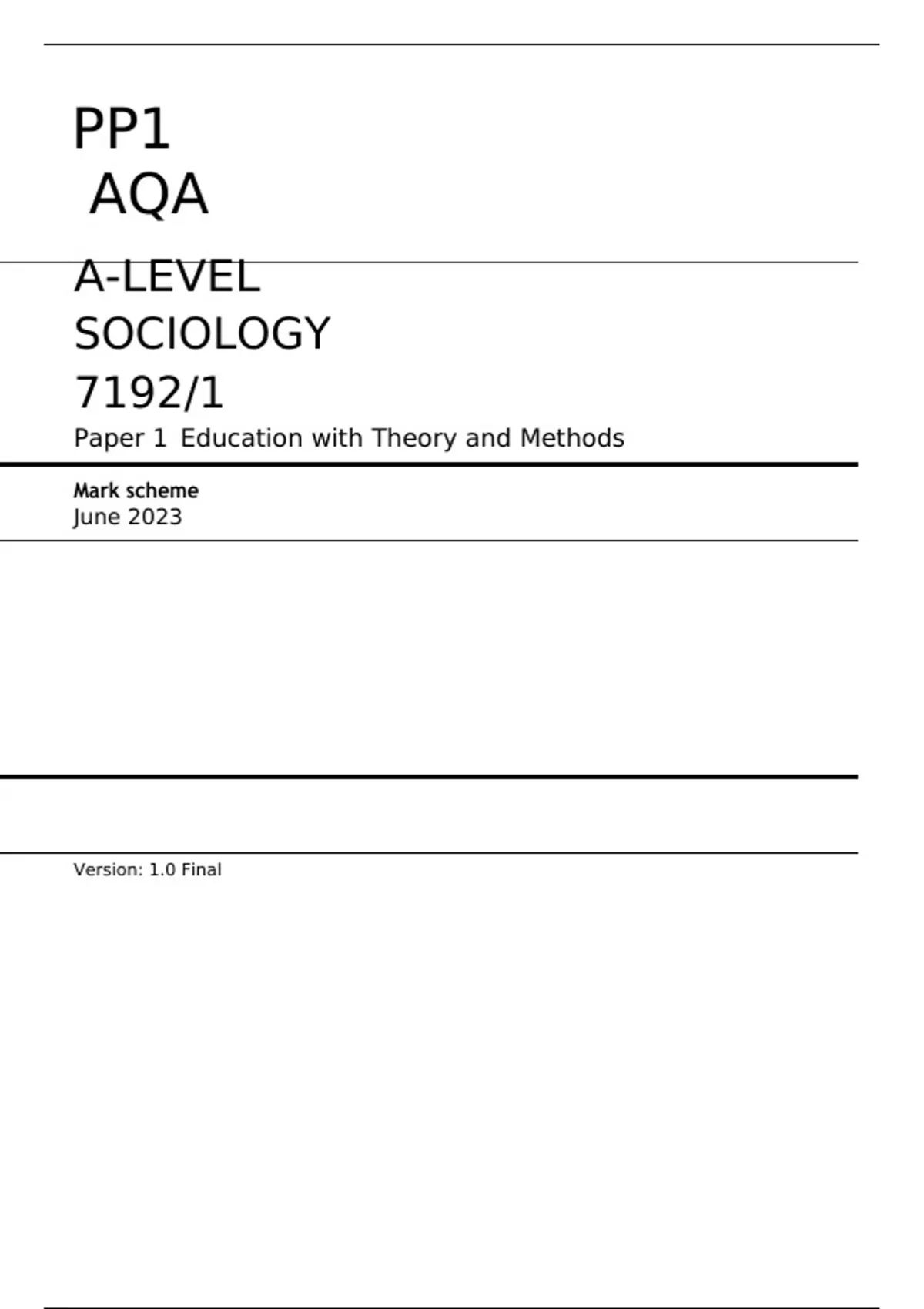 AQA A-LEVEL SOCIOLOGY 7192/1 Paper 1 June 2023 FINAL MARK SCHEME Education with Theory and Methods
