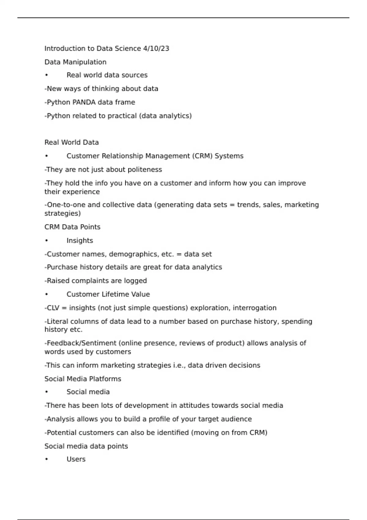 The document covers topics related to data manipulation, real-world data sources, exploratory data analysis (EDA), Python programming with Pandas, ethics in data science, and various techniques for analyzing and visualizing data. It includes examples, explanations, and references to specific tools and libraries, such as Pandas, Seaborn, and Python, to illustrate key concepts in data science. The content is organized into sections, each focusing on different aspects of data science, such as working with real-world datasets, understanding data sources, and exploring data through statistical analysis and visualization techniques. The document also emphasizes the importance of ethics in data science, addressing issues related to data privacy and the responsible use of information. The notes provide practical examples, walkthroughs, and explanations, making them suitable for a classroom setting or self-study in the field of data science. Overall, the document appears to be a comprehensive resource for individuals learning the fundamentals of data science and its practical applications using Python and related tools.