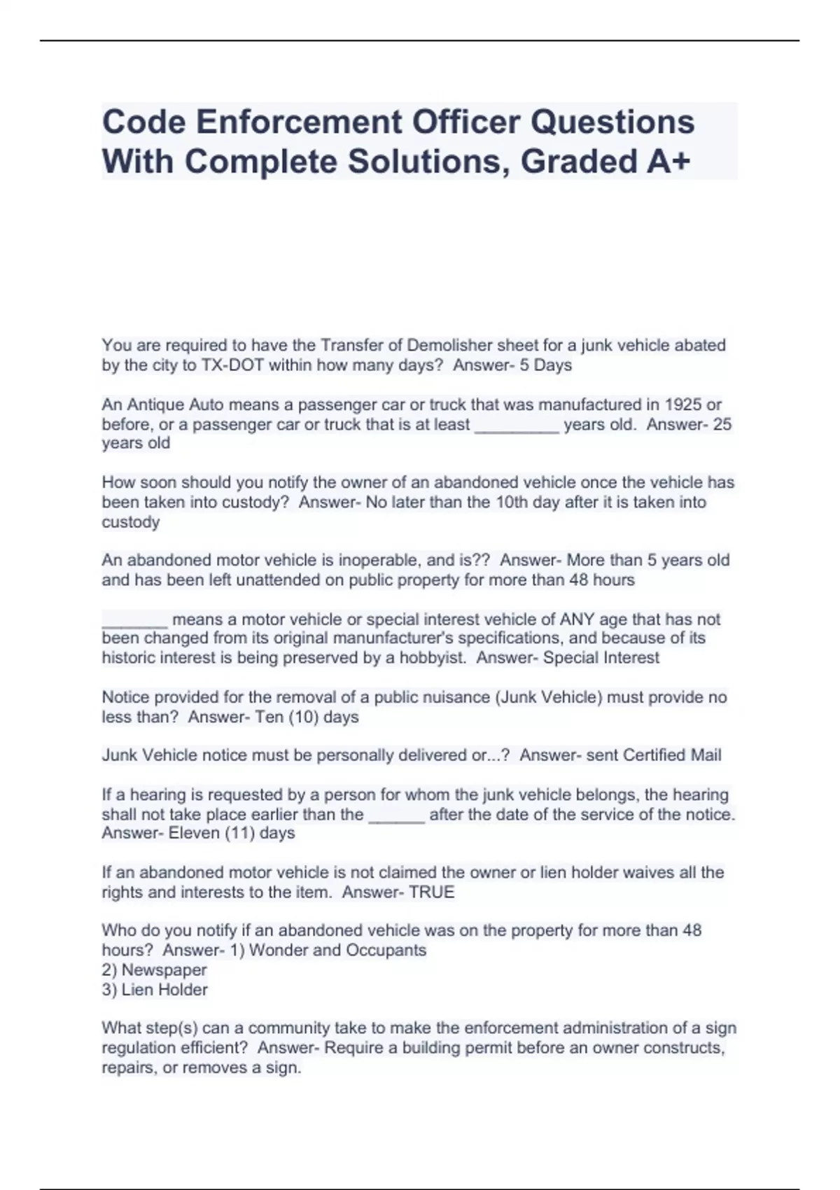 Code Enforcement Officer Questions With Complete Solutions, Graded A+