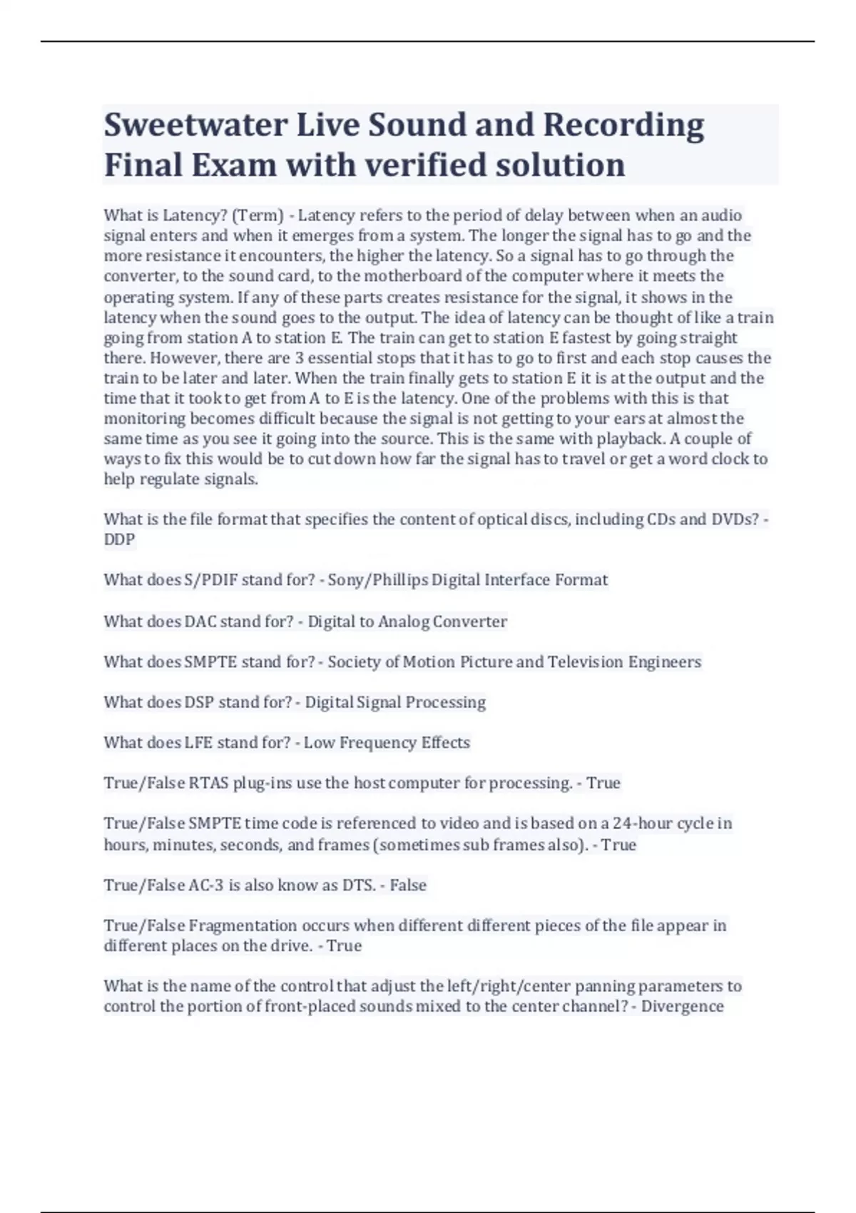 Sweetwater Live Sound and Recording Final Exam with verified solution What is Latency? (Term) - Latency refers to the period of delay between when an audio signal enters and when it emerges from a system. The longer the signal has to go and the more resistance it encounters, the higher the latency. So a signal has to go through the converter, to the sound card, to the motherboard of the computer where it meets the operating system. If any of these parts creates resistance for the signal, it shows in the latency when the sound goes to the output. The idea of latency can be thought of like a train going from station A to station E. The train can get to station E fastest by going straight there. However, there are 3 essential stops that it has to go to first and each stop causes the train to be later and later. When the train finally gets to station E it is at the output and the time that it took to get from A to E is the latency. One of the problems with this is that monitoring becomes difficult because the signal is not getting to your ears at almost the same time as you see it going into the source. This is the same with playback. A couple of ways to fix this would be to cut down how far the signal has to travel or get a word clock to help regulate signals. What is the file format that specifies the content of optical discs, including CDs and DVDs? - DDP What does S/PDIF stand for? - Sony/Phillips Digital Interface Format What does DAC stand for? - Digital to Analog Converter What does SMPTE stand for? - Society of Motion Picture and Television Engineers What does DSP stand for? - Digital Signal Processing What does LFE stand for? - Low Frequency Effects True/False RTAS plug-ins use the host computer for processing. - True True/False SMPTE time code is referenced to video and is based on a 24-hour cycle in hours, minutes, seconds, and frames (sometimes sub frames also). - True True/False AC-3 is also know as DTS. - False True/False Fragmentation occurs when different different pieces of the file appear in different places on the drive. - True What is the name of the control that adjust the left/right/center panning parameters to control the portion of front-placed sounds mixed to the center channel? - Divergence What two words refer to the removal and/or insertion of a device in a system while power is applied? - Hot swap What is the name of the plug-in format that Apple developed for CoreAudio under OS X? - Audio Units Write a description for the Zoom H6. - This is a portable 6 in 2 out recording system and USB interface. It has XY mics and 4 preamps. True/False The Crane Song Phoenix 2 plug-in works as an Avid DSP plug-in. - True True/False The Waves Gold Bundle works as an Avid DSP plug-in. - False True/False The Toontrack EZMix 2 plug in works as an Avid DSP plug-in. - False What does CDR stand for? - Compact Disc Recordable What does DAW stand for? - Digital Audio Workstation What does GUI stand for? - Graphic User Interface What does USB stand for? - Universal Serial Bus True/False USB is a high-speed data exchange protocol developed by Apple, also known as IEEE 1394. - False True/False Large diaphragm microphones tend to have less coloration than small diaphragm microphones. - False True/False A 24-bit system has exactly twice as much resolution as a 12-bit system. - False True/False The bit depth determines the possible dynamic range. - True True/False Aliasing is a problem that arises when the analog values being sampled falls between two digital "steps." - False What is the name for a digital audio signal that is at the maximum attainable signal within a given system? - Full Scale How many dB is the theoretical dynamic range of 24 bit digital audio? - 144 (multiply by 6) How many dB is the theoretical dynamic range of 16 bit digital audio? - 96 (multiply by 6) What type of editing process will not overwrite the original source? - Non-Destructive How many MB of memory are required to store a two-minute stereo sample at 16-bit, 44.1kHz? - 20 How many MB of memory are required to store a five-minute mono sample at 24-bit, 96kHz? - 86 What is a DAW? (term) - A DAW is a Digital Audio Workstation. The software programs are usually able to record, manipulate and playback audio. With a DAW you can have all the mixing, processing, and mastering on one computer. There are many different DAWs such as, Pro Tools, Logic, Ableton, Cubase, etc. Some DAWs run off your computer while others need a card that helps process all of the digital info. Plug-ins are also available with most DAWs. Plug-ins are small, "helper" programs that work inside your DAW to extend it's capability. So a DAW is like your car and the aftermarket accessories like tinted windows, new exhaust, etc. are the plug-ins. You can easily use the factory parts for the car and it will run just fine. However, the aftermarket accessories help make it unique to you and give you more of what you want. The PreSonus AudioBoxUSB connects to the computer using which of the following? A. USB B. Firewire C. PCI - A. USB The Lexicon Alpha connects to the computer using which of the following? A. USB B. Firewire C. PCI - A. USB