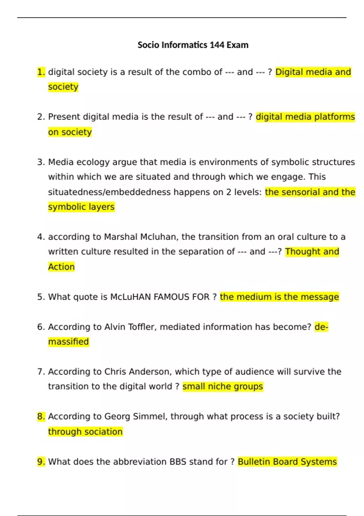 a result of the combo of --- and --- ? Digital media and society 2. Present digital media is the result of --- and --- ? digital media platforms on society 3. Media ecology argue that media is environments of symbolic structures within which we are situated and through which we engage. This situatedness/embeddedness happens on 2 levels: the sensorial and the symbolic layers 4. according to Marshal Mcluhan, the transition from an oral culture to a written culture resulted in the separation of --- and ---? Thought and Action 5. What quote is McLuHAN FAMOUS FOR ? the medium is the message 6. According to Alvin Toffler, mediated information has become? de-massified 7. According to Chris Anderson, which type of audience will survive the transition to the digital world ? small niche groups 8. According to Georg Simmel, through what process is a society built? through sociation 9. What does the abbreviation BBS stand for ? Bulletin Board Systems 10. What was the first social media site? Six degrees ()