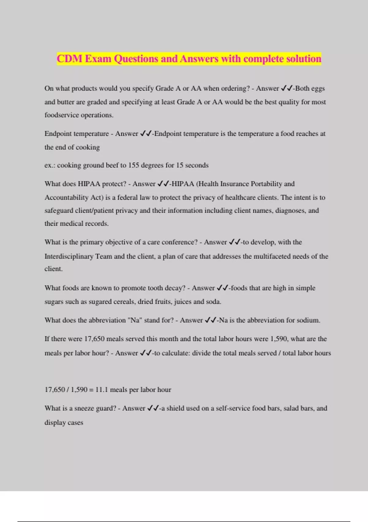 CDM Exam Questions and Answers with complete solution On what products would you specify Grade A or AA when ordering? - Answer ️️ -Both eggs and butter are graded and specifying at least Grade A or AA would be the best quality for most foodservice operations. Endpoint temperature - Answer ️️ -Endpoint temperature is the temperature a food reaches at the end of cooking ex.: cooking ground beef to 155 degrees for 15 seconds What does HIPAA protect? - Answer ️️ -HIPAA (Health Insurance Portability and Accountability Act) is a federal law to protect the privacy of healthcare clients. The intent is to safeguard client/patient privacy and their information including client names, diagnoses, and their medical records. What is the primary objective of a care conference? - Answer ️️ -to develop, with the Interdisciplinary Team and the client, a plan of care that addresses the multifaceted needs of the client. What foods are known to promote tooth decay? - Answer ️️ -foods that are high in simple sugars such as sugared cereals, dried fruits, juices and soda. What does the abbreviation "Na" stand for? - Answer ️️ -Na is the abbreviation for sodium. If there were 17,650 meals served this month and the total labor hours were 1,590, what are the meals per labor hour? - Answer ️️ -to calculate: divide the total meals served / total labor hours 17,650 / 1,590 = 11.1 meals per labor hour What is a sneeze guard? - Answer ️️ -a shield used on a self-service food bars, salad bars, and display cases What would be the cost per person for a catered event where the total costs are $885 and 65 people will be attending? - Answer ️️ -to calculate: divide the total costs / number of clients $885 / 65 = $13.62 round up to $13.75 per person What is the purpose of a performance review? - Answer ️️ --ensures that the supervisor and employee communicate needs and the supervisor provides feedback -identifies need for improvement and growth -may serve as a formal basis for wage increases How many total calories would be in a food product with 12 grams of carbs, 3 grams of fat, 2 grams of protein? - Answer ️️ -- Carbs: 12 x 4 = 48 -Fat 3 x9 = 27 -Protein 2 x4 = 8 Total = 8
