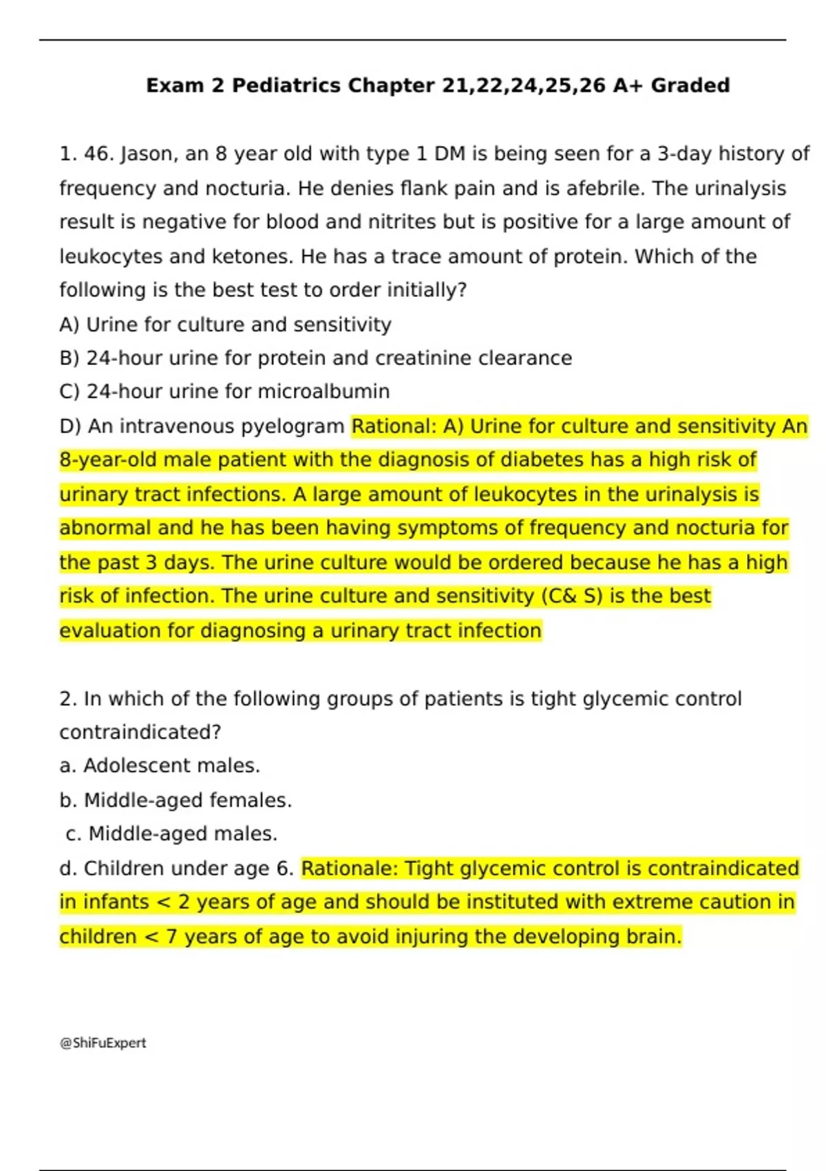 Exam 2 Pediatrics Chapter 21,22,24,25,26 A+ Graded 1. 46. Jason, an 8 year old with type 1 DM is being seen for a 3-day history of frequency and nocturia. He denies flank pain and is afebrile. The urinalysis result is negative for blood and nitrites but is positive for a large amount of leukocytes and ketones. He has a trace amount of protein. Which of the following is the best test to order initially? A) Urine for culture and sensitivity B) 24-hour urine for protein and creatinine clearance C) 24-hour urine for microalbumin D) An intravenous pyelogram Rational: A) Urine for culture and sensitivity An 8-year-old male patient with the diagnosis of diabetes has a high risk of urinary tract infections. A large amount of leukocytes in the urinalysis is abnormal and he has been having symptoms of frequency and nocturia for the past 3 days. The urine culture would be ordered because he has a high risk of infection. The urine culture and sensitivity (C& S) is the best evaluation for diagnosing a urinary tract infection 2. In which of the following groups of patients is tight glycemic control contraindicated? a. Adolescent males. b. Middle-aged females. c. Middle-aged males. d. Children under age 6. Rationale: Tight glycemic control is contraindicated in infants < 2 years of age and should be instituted with extreme caution in children < 7 years of age to avoid injuring the developing brain. 3. On initial exam of a child with newly diagnosed Kawasaki disease, the APRN would expect: 1. Dry, swollen, fissured lips. 2. Non-palpable lymph nodes. 3. Conjunctivitis with exudates. 4. Cyanosis of the hands and feet Answer: Dry, swollen, fissured lips are symptoms of Kawasaki disease. (Lymph nodes can be palpable, conjunctivitis is present but without exudates, and hands and feet are typically erythematous.) 4. Systemic medications like dicloxacillin should be used in the treatment of superficial folliculitis in which circumstances (check all that apply)? a. Sever3 cases -* b. Immunocompromised patients- * c. Patient's with atopic dermatitis d. Patient's diagnosed with diabetes - * a, b, d 5. You are seeing a 17-year-old female patient. During the visit, you consider her risk factors for type 2 DM would likely include all of the following except: A. Obesity B. Native American ancestry C. Family history of type 1 DM D. Personal history of polycystic ovary syndrome Answer C 6. The most common cause of hyperthyroidism in children and adolescents is a-Graves Disease b-thyroid cancer c-thyroid nodules d-pituitary tumor a-Graves Disease 7. An infant with polydipsia, polyuria, irritability and failure to thrive should be evaluated for: a-Diabetes Insipidus b-Homocystinuria c-Growth Hormone Deficiency d-hyperglycemia a-Diabetes Insipidus 8. Which of the following is not a signs or symptoms of congenital hypothyroidism? a-hoarse cry b-frequent stooling c-course features D-lethargy b-frequent stooling 9. A 9 yo boy presents with a fever of 102 F and complaint of leg pain. His mother reports that he had an upper respiratory infection with a sore throat about 2 weeks ago, which subsided without therapy. On physical examination he has tender swollen knees. Hr is 120 and a blowing systolic murmur is heard at the apex. No murmur was noted at the previous well visit. The most likely diagnosis is: a-kawasaki disease b-rheumatic fever c-sickle cell anemia d-viral illness b-rheumatic fever 10. When counseling an adolescent with a family history of hyperinsulinemia and type 2 diabetes, the primary care pediatric nurse practitioner will recommend avoiding Processed breads Canned vegetables Baked potato chips High-fiber cereals Processed breads 11. Antipyretics are ineffective in what types of fever? Raising of the hypothalamic set point in the CNS Result of heat production exceeding heat loss Defective heat loss Rationale: antipyretics are ineffective for 2 and 3 12. Fever accounts for 30% of office and emergency room visits? T/F 10 %- to 20% answer is false 13. Fever is the least common presenting complaint to a pediatric practice T/F Answer is False- most common complaint