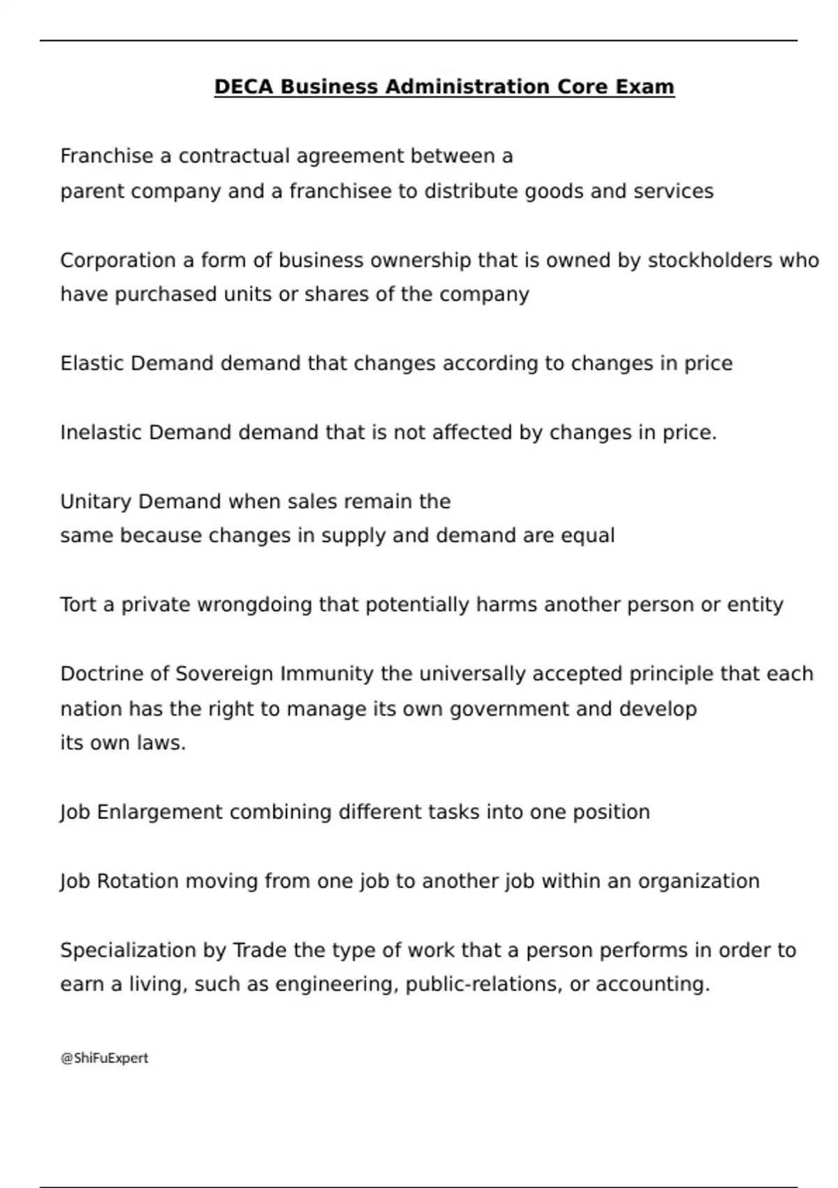 DECA Business Administration Core Exam Franchise a contractual agreement between a parent company and a franchisee to distribute goods and services Corporation a form of business ownership that is owned by stockholders who have purchased units or shares of the company Elastic Demand demand that changes according to changes in price Inelastic Demand demand that is not affected by changes in price. Unitary Demand when sales remain the same because changes in supply and demand are equal Tort a private wrongdoing that potentially harms another person or entity Doctrine of Sovereign Immunity the universally accepted principle that each nation has the right to manage its own government and develop its own laws. Job Enlargement combining different tasks into one position Job Rotation moving from one job to another job within an organization Specialization by Trade the type of work that a person performs in order to earn a living, such as engineering, public-relations, or accounting. Frictional Unemployment occurs because there are always workers who are in transition Structural Unemployment when the demand for certain types of workers declines and is often due to technology advancements and the need for new skills Cyclical Employment result of changes in the economic and business cycles Wage Garnishments court-ordered initiatives that involve taking income taken from an employee's salary and submitting it to another person or organization