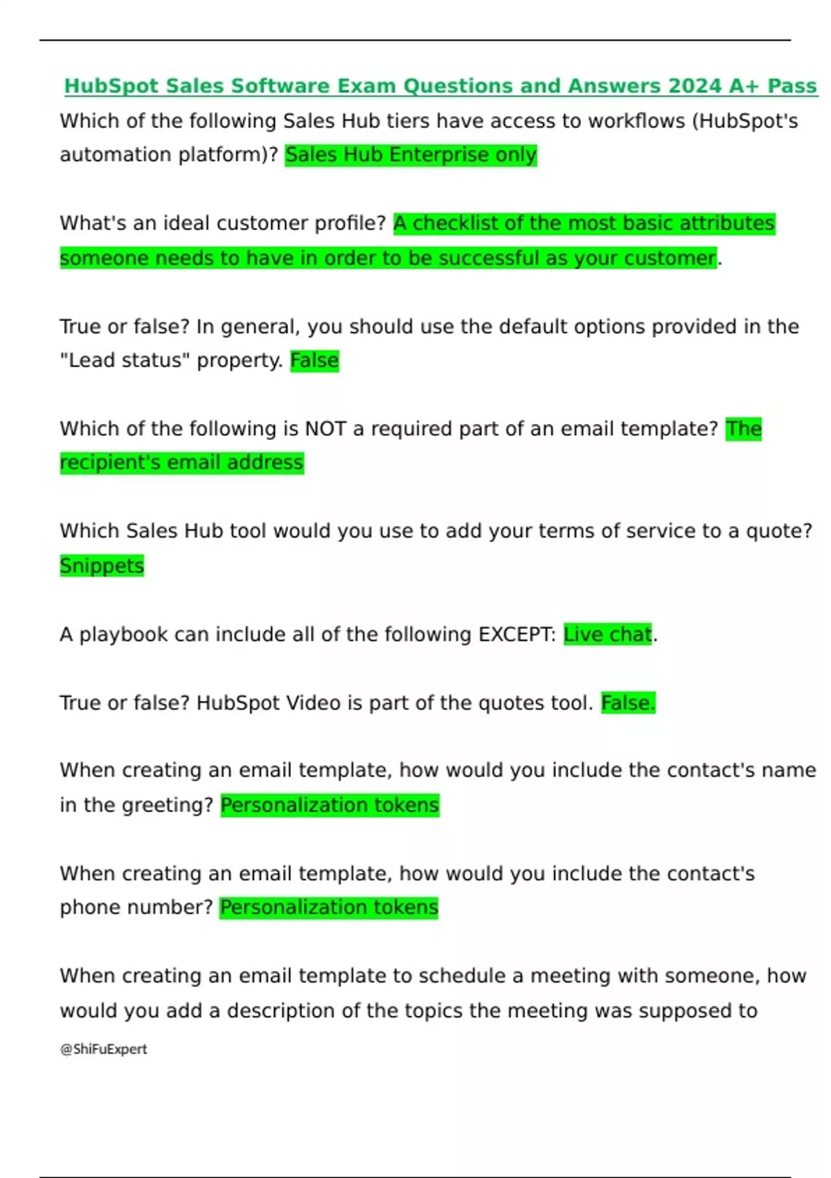 HubSpot Sales Software Exam Questions and Answers 2024 A+ Pass Which of the following Sales Hub tiers have access to workflows (HubSpot's automation platform)? Sales Hub Enterprise only What's an ideal customer profile? A checklist of the most basic attributes someone needs to have in order to be successful as your customer. True or false? In general, you should use the default options provided in the "Lead status" property. False Which of the following is NOT a required part of an email template? The recipient's email address Which Sales Hub tool would you use to add your terms of service to a quote? Snippets A playbook can include all of the following EXCEPT: Live chat. True or false? HubSpot Video is part of the quotes tool. False. When creating an email template, how would you include the contact's name in the greeting? Personalization tokens When creating an email template, how would you include the contact's phone number? Personalization tokens When creating an email template to schedule a meeting with someone, how would you add a description of the topics the meeting was supposed to cover? For example, "I'd love to find a time to dive deeper into [insert topic here].") Fill-in-the-blank areas When creating an email template, how would you add the next steps? For example, "If you'd still like to talk about this, please let me know the best time to reach you." Static text When creating an email template, how would you add a personalized closing line? Fill-in-the-blank areas What are deal stages? The important milestones a person has to pass in order to become your customer. How has the internet changed the relationship between buyers and sellers? Customers have more options for sharing their opinions of your company with other prospective buyers.