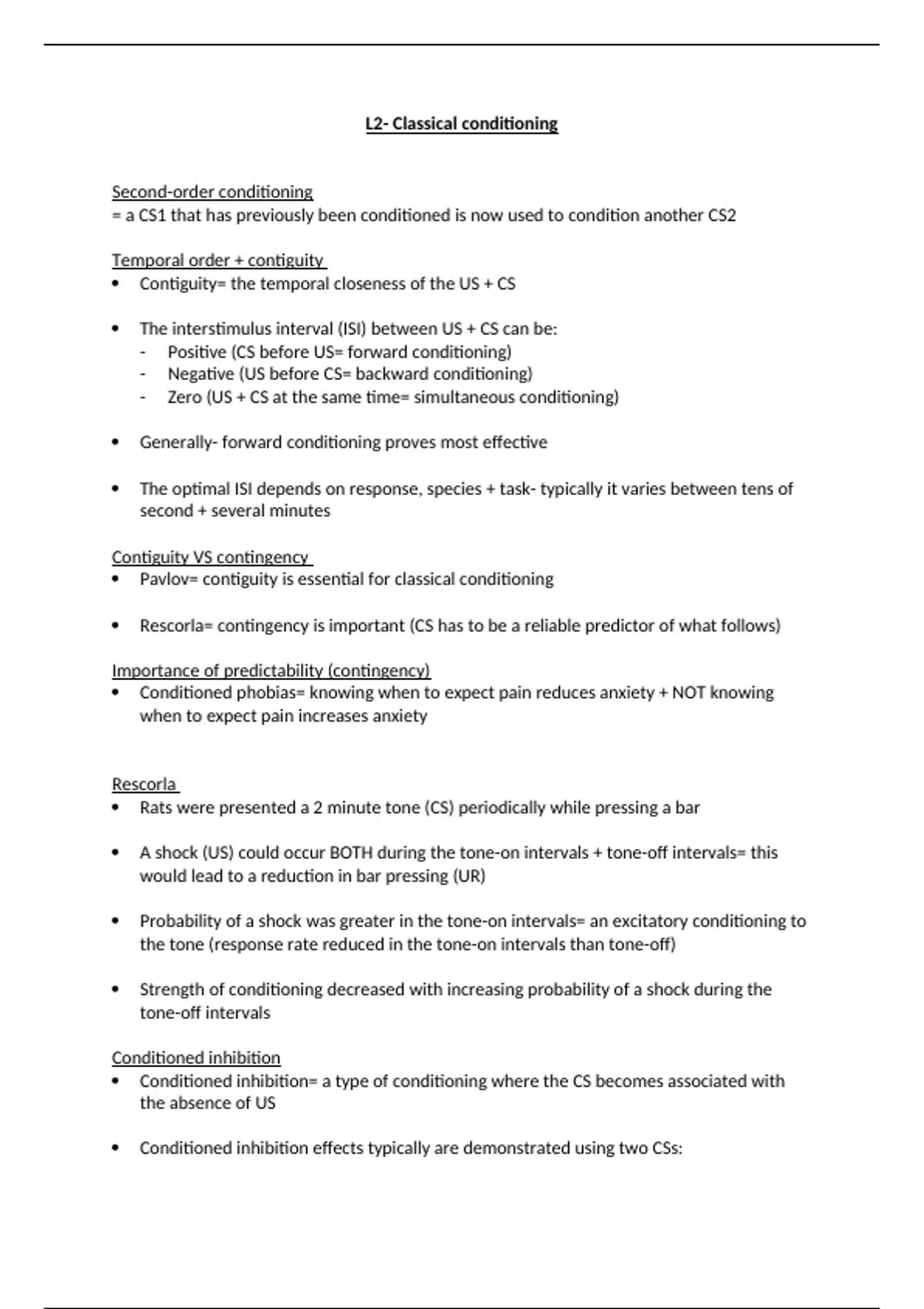 Rescorla= contingency is important (CS has to be a reliable predictor of what follows)