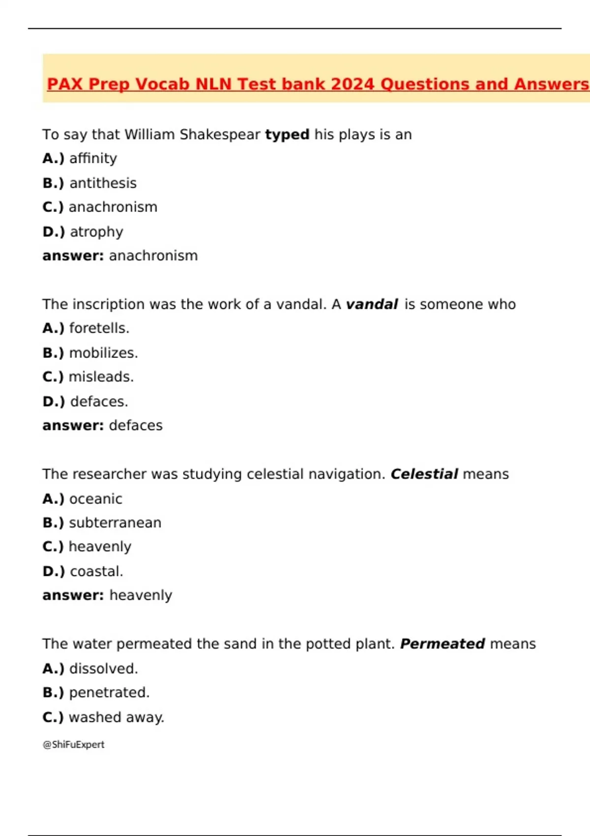 PAX Prep Vocab NLN Test bank 2024 Questions and Answers To say that William Shakespear typed his plays is an A.) affinity B.) antithesis C.) anachronism D.) atrophy answer: anachronism The inscription was the work of a vandal. A vandal is someone who A.) foretells. B.) mobilizes. C.) misleads. D.) defaces. answer: defaces The researcher was studying celestial navigation. Celestial means A.) oceanic B.) subterranean C.) heavenly D.) coastal. answer: heavenly The water permeated the sand in the potted plant. Permeated means A.) dissolved. B.) penetrated. C.) washed away. D.) packed down. answer: penetrated The suspect was apprehended by the crowd. The suspect was A.) seized. B.) engulfed. C.) pursued. D.) attacked. answer: seized Those who will not be present must vote by A.) rote. B.) intonation. C.) orientation. D.) proxy. answer: proxy The police officer had no qualms about taking on the difficult patrol. Qualm means A.) forethought. B.) conscience. C.) delicacy. D.) apprehension. answer: apprehension. The writer gained fame by plagiarizing the content of his novel. Plagiarize means to A.) steal. B.) slander. C.) misquote. D.) prevaricate. answer: steal The revolutionary government made overtures to the opposition. Overture means a A.) proposal. B.) promise. C.) truce. D.) threat. answer: proposal
