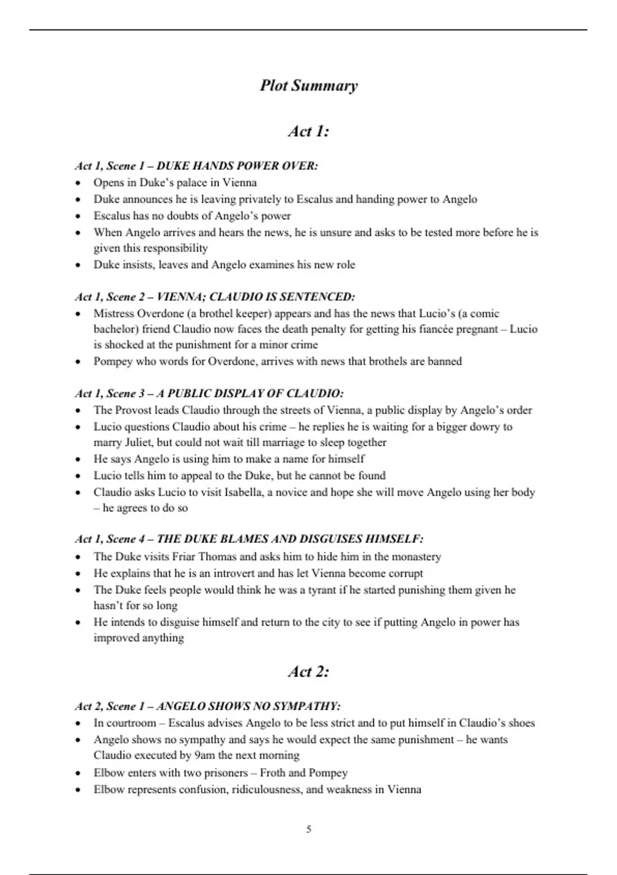 An act to act summary of Shakespeare's Measure for Measure, suitable for English Literature A-Level