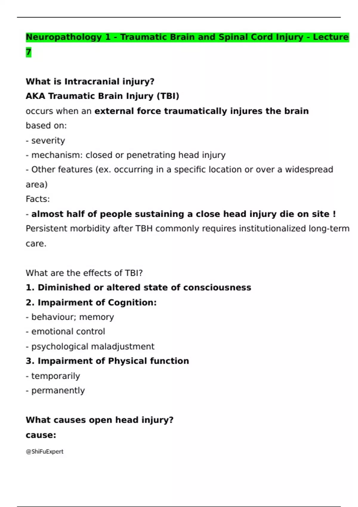 Neuropathology 1 - Traumatic Brain and Spinal Cord Injury - Lecture 7 What is Intracranial injury? AKA Traumatic Brain Injury (TBI) occurs when an external force traumatically injures the brain based on: - severity - mechanism: closed or penetrating head injury - Other features (ex. occurring in a specific location or over a widespread area) Facts: - almost half of people sustaining a close head injury die on site ! Persistent morbidity after TBH commonly requires institutionalized long-term care. What are the effects of TBI? 1. Diminished or altered state of consciousness 2. Impairment of Cognition: - behaviour; memory - emotional control - psychological maladjustment 3. Impairment of Physical function - temporarily - permanently What causes open head injury? cause: - head and neck trauma - penetrating missile injury characteristics of open head injury