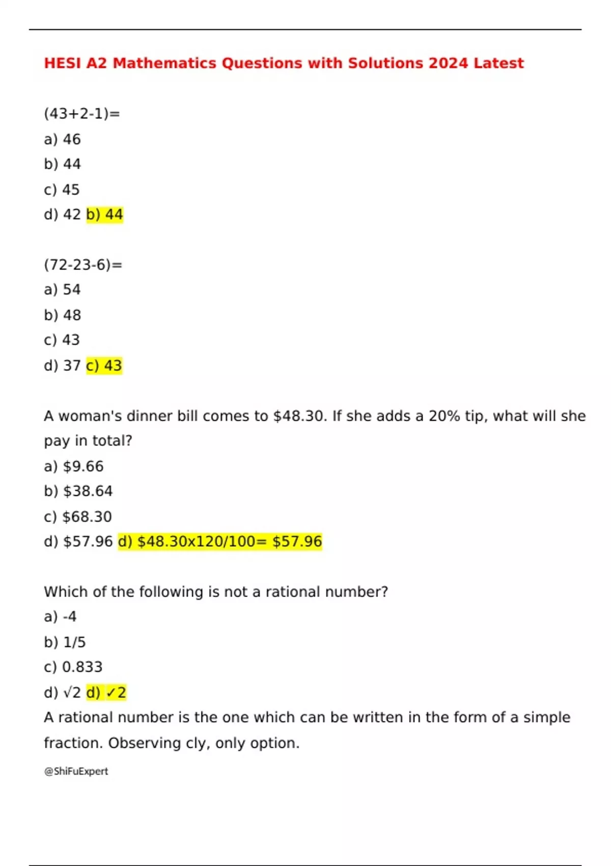 HESI A2 Mathematics Questions with Solutions 2024 Latest (43+2-1)= a) 46 b) 44 c) 45 d) 42 b) 44 (72-23-6)= a) 54 b) 48 c) 43 d) 37 c) 43 A woman's dinner bill comes to $48.30. If she adds a 20% tip, what will she pay in total? a) $9.66 b) $38.64 c) $68.30 d) $57.96 d) $48.30x120/100= $57.96 Which of the following is not a rational number? a) -4 b) 1/5 c) 0.833 d) √2 d) 2 A rational number is the one which can be written in the form of a simple fraction. Observing cly, only option. What is 1230.932567 rounded to the nearest hundredth? a) 1200 b) 1230.9326 c) 1230.93 d) 1230 c) You are asked to round this given number to the nearest hundredth. Considering the numbers on the right of the decimal, the answer is 1230.93 What is the absolute value of -9? a) -9 b) 9 c) 0 d) -1 b) The absolute value of any negative number gives the positive of that same number, i.e., absolute value of -9 is +9