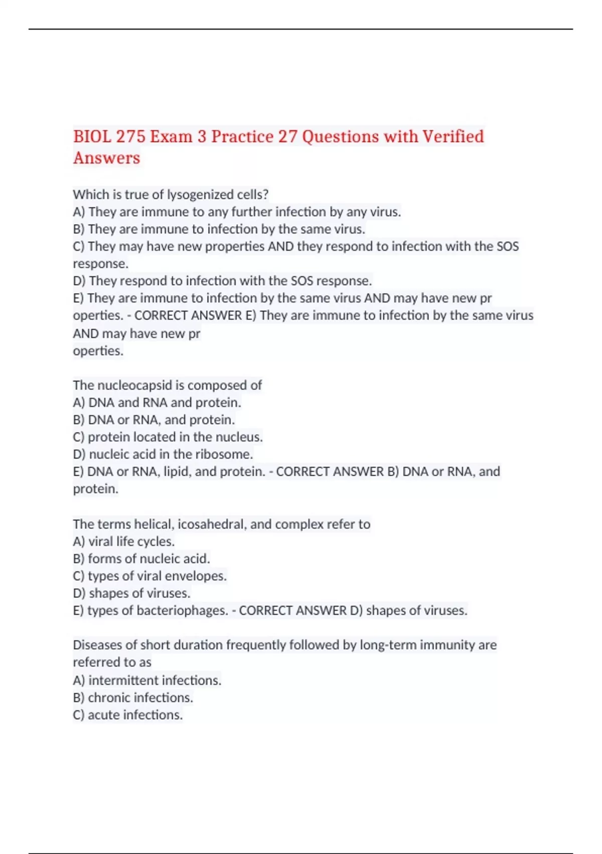 BIOL 275 Exam 3 Practice 27 Questions with Verified Answers Which is true of lysogenized cells? A) They are immune to any further infection by any virus. B) They are immune to infection by the same virus. C) They may have new properties AND they respond to infection with the SOS response. D) They respond to infection with the SOS response. E) They are immune to infection by the same virus AND may have new pr operties. - CORRECT ANSWER E) They are immune to infection by the same virus AND may have new pr operties. The nucleocapsid is composed of A) DNA and RNA and protein. B) DNA or RNA, and protein. C) protein located in the nucleus. D) nucleic acid in the ribosome. E) DNA or RNA, lipid, and protein. - CORRECT ANSWER B) DNA or RNA, and protein. The terms helical, icosahedral, and complex refer to A) viral life cycles. B) forms of nucleic acid. C) types of viral envelopes. D) shapes of viruses. E) types of bacteriophages. - CORRECT ANSWER D) shapes of viruses. Diseases of short duration frequently followed by long-term immunity are referred to as A) intermittent infections. B) chronic infections. C) acute infections. D) persistent infections. E) nonacute infections. - CORRECT ANSWER C) acute infections. Genetic exchange in segmented viruses that allows a zoonotic virus to infect humans is an example A) antigenic shift. B) hemagglutination. C) genetic reassortment. D) antigenic drift. E) mutagenesis. - CORRECT ANSWER A) antigenic shift. Plant viruses enter the host plant via A) wound sites. B) specific receptors. C) nonspecific receptors. D) seeds. E) endocytosis. - CORRECT ANSWER A) wound sites. Which of the following is NOT true of prions? A) Prions replicate by converting normal host prion proteins into abnormal prion proteins. B) Prions responsible for "mad cow disease" can cause a similar disease in humans. C) Prions can be transmitted by consumption of dried food or cooked food. D) Prions that cause spongiform encephalopathies have a different amino acid sequence from PrPc. E) All of the answer choices are correct. - CORRECT ANSWER D) Prions that cause spongiform encephalopathies have a different amino acid sequence from PrPc. Please select the TRUE statement regarding bacteriophage life cycles. A) Temperate phages lyse their host cells, whereas lytic phages either lyse their host or integrate their DNA into the host cell's genome. B) Lytic phages lyse their host cells, whereas temperate phages either lyse their host or integrate their DNA into the host cell's genome. C) In the bacteriophage life cycle, the entire virus enters the host bacterial cell through a hole in the cell wall. D) Phage particles seek out their bacterial hosts by means of chemotaxis and then attach to random receptors on the host's cell wall. E) The burst size is the number of bacterial cells that are lysed as a result of being infected by a bacteriophage such as T4. - CORRECT ANSWER B) Lytic phages lyse their host cells, whereas temperate phages either lyse their host or integrate their DNA into the host cell's genome. To give more information on virus replication strategies, you explain to your friend the difference between a DNA virus and a RNA virus in terms of replication. You tell him that A) RNA virus replication always requires a virally encoded RNA polymerase that is an RNA-dependent RNA polymerase; this enzyme uses an RNA template to synthesize a new strand of RNA. DNA viruses use DNA-dependent DNA polymerase in replication. B) RNA virus replication always requires a virally encoded DNA polymerase, that is an RNA-dependent DNA polymerase; this enzyme uses a DNA template to synthesize a new strand of RNA. DNA viruses use DNA-dependent DNA polymerase in replication. C) RNA viruses always encode an enzyme called reverse transcriptase, which is an RNA-dependent DNA polymerase that synthesizes DNA from an RNA template. DNA viruses use DNA-dependent RNA polymerase in replication. D) DNA viruses replicate their genome by means of - CORRECT ANSWER A) RNA virus replication always requires a virally encoded RNA polymerase that is an RNA-dependent RNA polymerase; this enzyme uses an RNA template to synthesize a new strand of RNA. DNA viruses use DNA-dependent DNA polymerase in replication. Which is not a component of innate immunity? A) Skin B) Antibody C) Inflammation D) Fever E) Mucus membranes - CORRECT ANSWER B) Antibody Which statement about skin and mucous membranes is NOT correct? A) They are the first line of innate immunity. B) They are the first line of adaptive immunity. C) They act as physical barriers to infection. D) They contain antimicrobial secretions. E) They separate us from our environment. - CORRECT ANSWER B) They are the first line of adaptive immunity. In humans, the stem cells from which all blood cells arise are found in the A) peripheral circulation. B) bone marrow. C) lymphatic vessels. D) lymph nodes. E) spleen. - CORRECT ANSWER B) bone marrow. The cells responsible for adaptive immunity are the A) lymphocytes. B) monocytes. C) eosinophils. D) neutrophils. E) leukocytes. - CORRECT ANSWER A) lymphocytes. The complement pathway that is activated by mannan-binding protein is the A) classical pathway. B) alternative pathway. C) C3 pathway. D) lectin pathway. E) properdin pathway. - CORRECT ANSWER D) lectin pathway. Interferons function to make cells A) prevent viral replication. B) lyse when exposed to virus. C) non-motile when infected with virus. D) resistant to phagocytosis. E) form endospores. - CORRECT ANSWER A) prevent viral replication. What two functions do phagocytes serve in immune responses? A) Production of antibodies AND engulfment/destruction of foreign cells. B) Engulfment/destruction of foreign cells AND alerting the other cells of the immune system to an invader. C) Alerting the other cells of the immune system to an invader AND serving as a physical barrier against microbial invasion. D) Production of antibodies AND serving as a physical barrier against microbial invasion