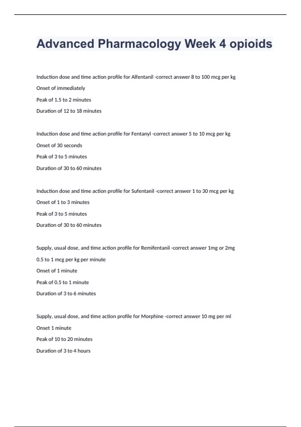 Advanced Pharmacology Week 4 opioidsInduction dose and time action profile for Alfentanil -correct answer 8 to 100 mcg per kg Onset of immediately Peak of 1.5 to 2 minutes Duration of 12 to 18 minutes Induction dose and time action profile for Fentanyl -correct answer 5 to 10 mcg per kg Onset of 30 seconds Peak of 3 to 5 minutes Duration of 30 to 60 minutes Induction dose and time action profile for Sufentanil -correct answer 1 to 30 mcg per kg Onset of 1 to 3 minutes Peak of 3 to 5 minutes Duration of 30 to 60 minutes Supply, usual dose, and time action profile for Remifentanil -correct answer 1mg or 2mg 0.5 to 1 mcg per kg per minute Onset of 1 minute Peak of 0.5 to 1 minute Duration of 3 to 6 minutes Supply, usual dose, and time action profile for Morphine -correct answer 10 mg per ml Onset 1 minute Peak of 10 to 20 minutes Duration of 3 to 4 hours