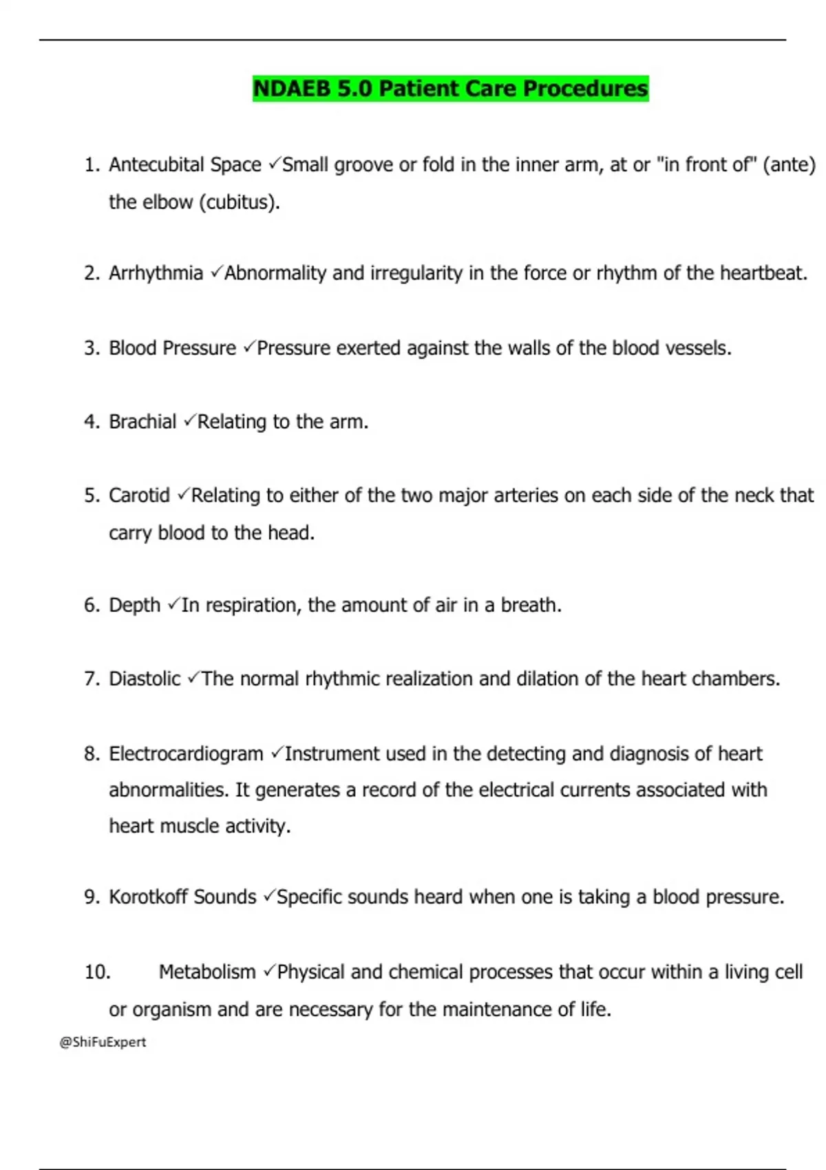 NDAEB 5.0 Patient Care Procedures 1. Antecubital Space Small groove or fold in the inner arm, at or "in front of" (ante) the elbow (cubitus). 2. Arrhythmia Abnormality and irregularity in the force or rhythm of the heartbeat. 3. Blood Pressure Pressure exerted against the walls of the blood vessels. 4. Brachial Relating to the arm. 5. Carotid Relating to either of the two major arteries on each side of the neck that carry blood to the head. 6. Depth In respiration, the amount of air in a breath. 7. Diastolic The normal rhythmic realization and dilation of the heart chambers. 8. Electrocardiogram Instrument used in the detecting and diagnosis of heart abnormalities. It generates a record of the electrical currents associated with heart muscle activity. 9. Korotkoff Sounds Specific sounds heard when one is taking a blood pressure. 10. Metabolism Physical and chemical processes that occur within a living cell or organism and are necessary for the maintenance of life. 11. Oximetry Measurement of oxygen concentration in the blood. 12. Palpate To examine or explore by touching. 13. Pulse Rhythmic throbbing of the arteries produced by regular contractions of the heart. 14. Radial Related to the radius (bone) or foramen (ante brachium). 15. Rate A quantity measured, as in breaths and heartbeats. 16. Respiration Act or process of inhaling and exhaling (breathing). 17. Rhythm A sequence or pattern, such as the heartbeat of breathing. 18. Sphygmomanometer Instrument for measuring blood pressure in the arteries. 19. Stethoscope Instrument used for listening to sounds produced within the body.