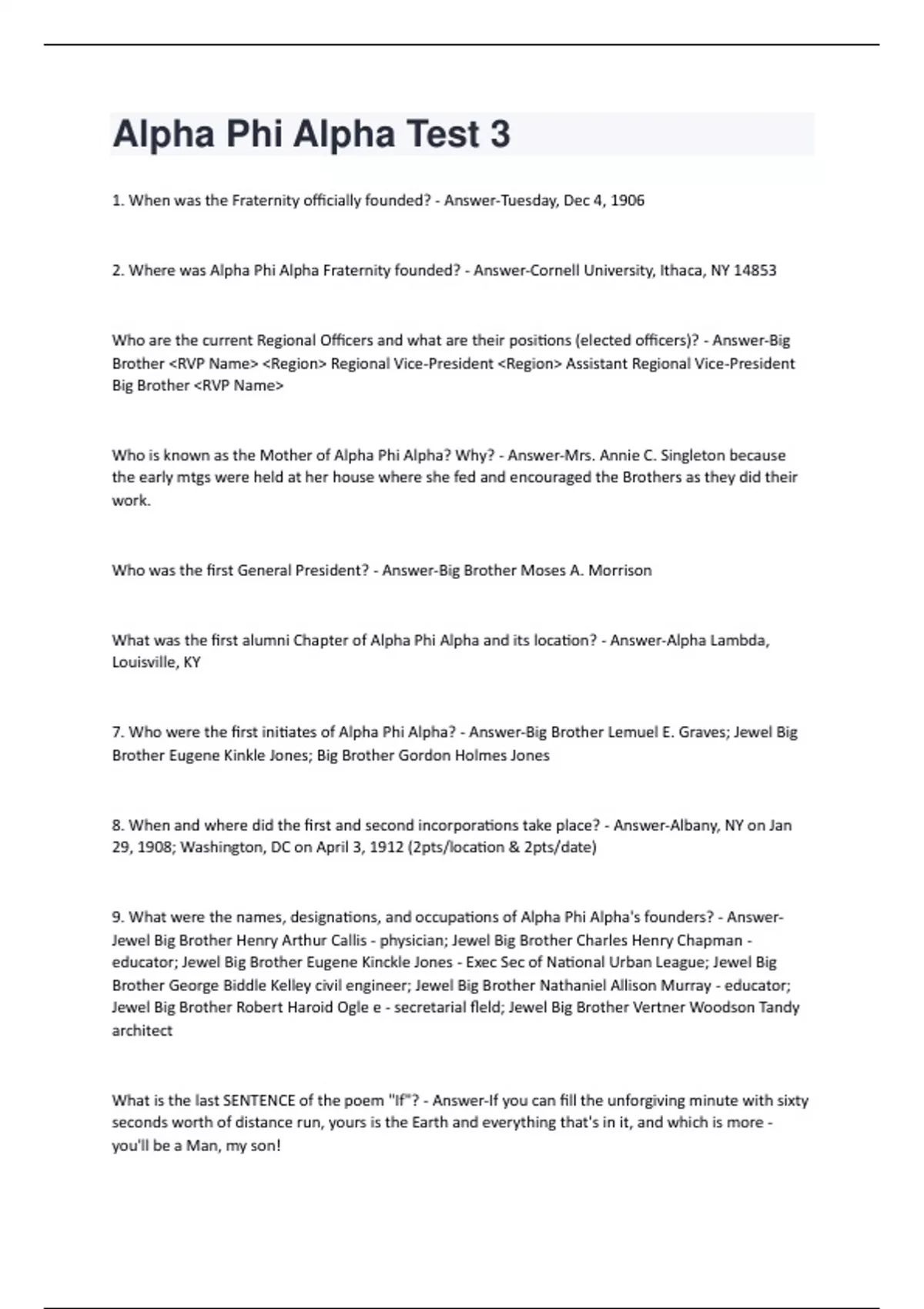 1. When was the Fraternity officially founded? - Answer-Tuesday, Dec 4, 1906 2. Where was Alpha Phi Alpha Fraternity founded? - Answer-Cornell University, Ithaca, NY 14853 Who are the current Regional Officers and what are their positions (elected officers)? - Answer-Big Brother RVP Name Region Regional Vice-President Region Assistant Regional Vice-President Big Brother RVP Name Who is known as the Mother of Alpha Phi Alpha? Why? - Answer-Mrs. Annie C. Singleton because the early mtgs were held at her house where she fed and encouraged the Brothers as they did their work. Who was the first General President? - Answer-Big Brother Moses A. Morrison What was the first alumni Chapter of Alpha Phi Alpha and its location? - Answer-Alpha Lambda, Louisville, KY 7. Who were the first initiates of Alpha Phi Alpha? - Answer-Big Brother Lemuel E. Graves; Jewel Big Brother Eugene Kinkle Jones; Big Brother Gordon Holmes Jones 8. When and where did the first and second incorporations take place? - Answer-Albany, NY on Jan 29, 1908; Washington, DC on April 3, 1912 (2pts/location & 2pts/date) 9. What were the names, designations, and occupations of Alpha Phi Alpha's founders? - AnswerJewel Big Brother Henry Arthur Callis - physician; Jewel Big Brother Charles Henry Chapman - educator; Jewel Big Brother Eugene Kinckle Jones - Exec Sec of National Urban League; Jewel Big Brother George Biddle Kelley civil engineer; Jewel Big Brother Nathaniel Allison Murray - educator; Jewel Big Brother Robert Haroid Ogle e - secretarial fleld; Jewel Big Brother Vertner Woodson Tandy architect What is the last SENTENCE of the poem "If"? - Answer-If you can fill the unforgiving minute with sixty seconds worth of distance run, yours is the Earth and everything that's in it, and which is more - you'll be a Man, my son!11. What is the complete title of the Fraternity's History Book? - Answer-The History af Alpha Phi Alpha: A Development in College Life To whom is the History book of Alpha Phi Alpha dedicated? - Answer-To the youths who march onward and upward toward the light, this volume is respectfully dedicated 13. What are the titles of the first seven chapters of the History Book? - Answer-Chapter 1- The Origin of Alpha Phi Alpha; Chapter 2 - The Period of Consolidation; Chapter 3 - The First Steps in Expansion; Chapter 4 LOCAI and Natlonal Strivings; Chaprer 5 - Permanent Foundarions; Chanter 6 - Fxnansion and Internal Development; Chapter 7- The Leaven of Self-Examination Who proposed the name of the Fralernity? - Answer-Jewel Big Brother Georye B. Kelley thouytı he glves credit to Jewel Big Brother Henry A. Callis (acceptabie if he only puts Kelley's name) Where was the first initiation banquet held? - Answer-Masonic Hall (accept Redman's Hall or Odd Fellows' Hall) List seven items from the menu of the first initiation banquet. - Answer-Cream Tomato Soup: Salted Wafers Bróiled Lamb Chops; Hashed Brown Potatoes; Finger Rolls; Peas In Tubs; Wild Apple Jelly: Shrimp Salad: Rolled Bread; Olives; Pickles; Neapolitan Ice Cream; Lady Fingers; Chocolate Cake; Demi-tasse; Crackers; Cheese; Alpha Phi Alpha Punch; Brotherhood Smoke