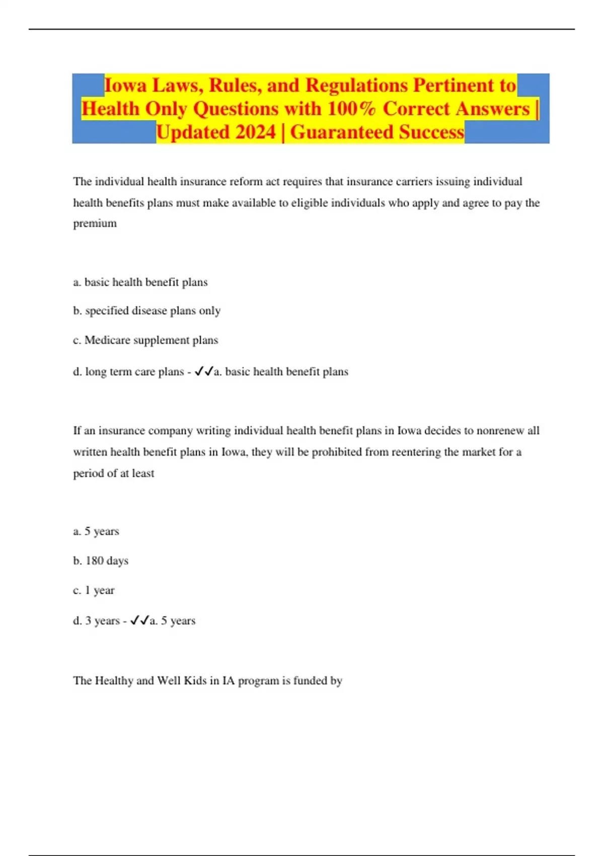 The individual health insurance reform act requires that insurance carriers issuing individual health benefits plans must make available to eligible individuals who apply and agree to pay the premium a. basic health benefit plans b. specified disease plans only c. Medicare supplement plans d. long term care plans - a. basic health benefit plans If an insurance company writing individual health benefit plans in Iowa decides to nonrenew all written health benefit plans in Iowa, they will be prohibited from reentering the market for a period of at least a. 5 years b. 180 days c. 1 year d. 3 years - a. 5 years The Healthy and Well Kids in IA program is funded by