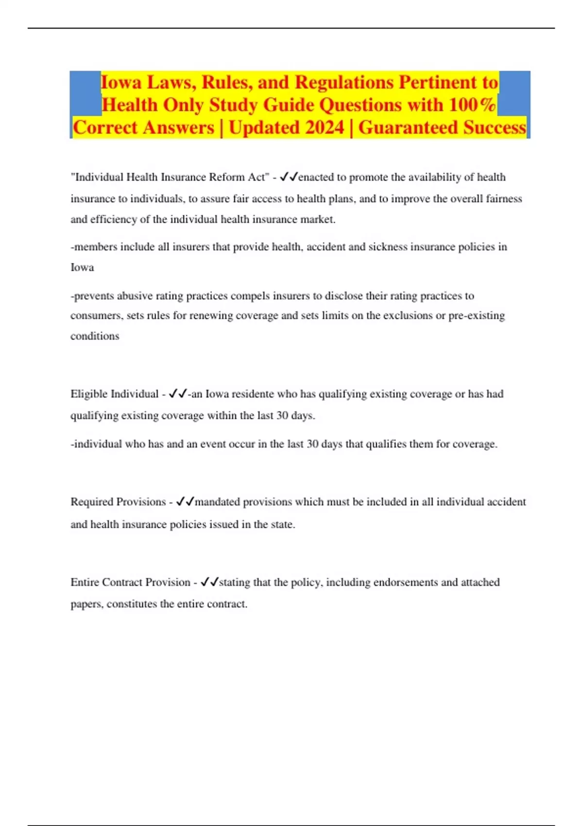 "Individual Health Insurance Reform Act" - enacted to promote the availability of health insurance to individuals, to assure fair access to health plans, and to improve the overall fairness and efficiency of the individual health insurance market. -members include all insurers that provide health, accident and sickness insurance policies in Iowa -prevents abusive rating practices compels insurers to disclose their rating practices to consumers, sets rules for renewing coverage and sets limits on the exclusions or pre-existing conditions Eligible Individual - -an Iowa residente who has qualifying existing coverage or has had qualifying existing coverage within the last 30 days. -individual who has and an event occur in the last 30 days that qualifies them for coverage. Required Provisions - mandated provisions which must be included in all individual accident and health insurance policies issued in the state. Entire Contract Provision - stating that the policy, including endorsements and attached papers, constitutes the entire contract