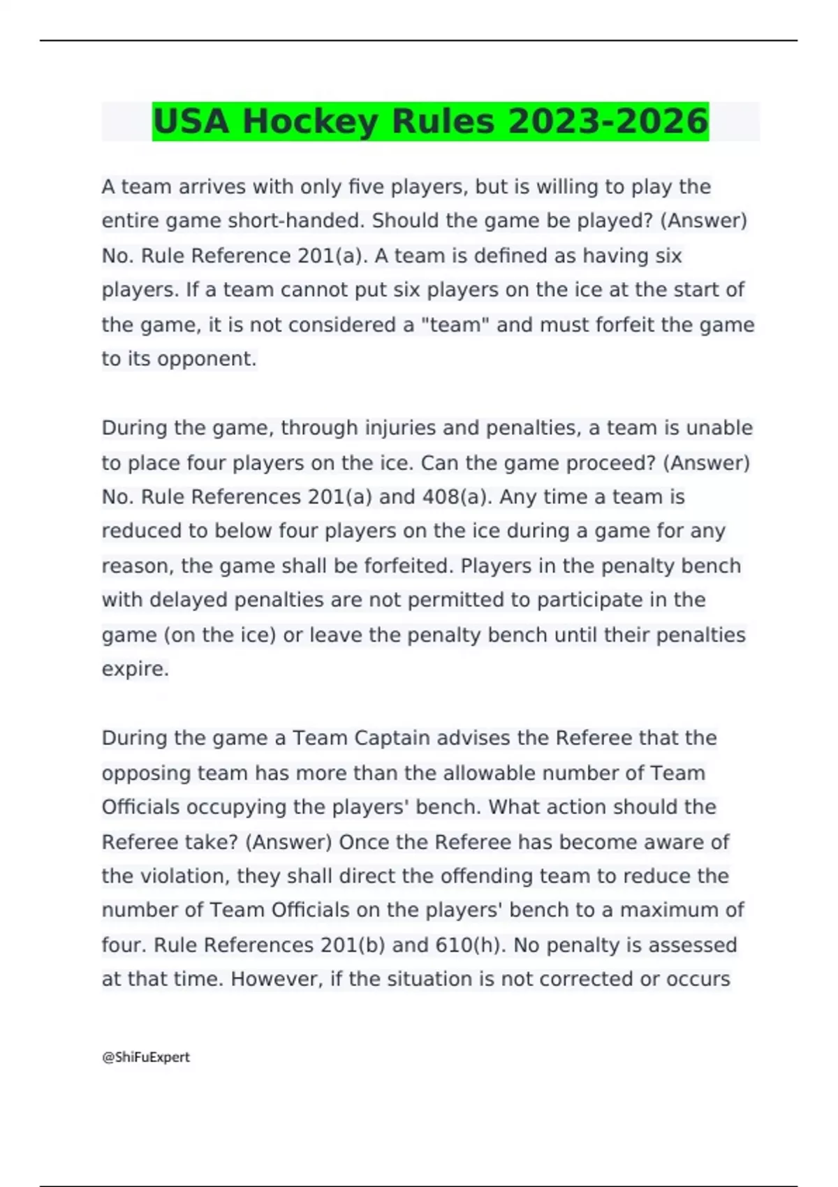 USA Hockey Rules A team arrives with only five players, but is willing to play the entire game short-handed. Should the game be played? (Answer) No. Rule Reference 201(a). A team is defined as having six players. If a team cannot put six players on the ice at the start of the game, it is not considered a "team" and must forfeit the game to its opponent. During the game, through injuries and penalties, a team is unable to place four players on the ice. Can the game proceed? (Answer) No. Rule References 201(a) and 408(a). Any time a team is reduced to below four players on the ice during a game for any reason, the game shall be forfeited. Players in the penalty bench with delayed penalties are not permitted to participate in the game (on the ice) or leave the penalty bench until their penalties expire. During the game a Team Captain advises the Referee that the opposing team has more than the allowable number of Team Officials occupying the players' bench. What action should the Referee take? (Answer) Once the Referee has become aware of the violation, they shall direct the offending team to reduce the number of Team Officials on the players' bench to a maximum of four. Rule References 201(b) and 610(h). No penalty is assessed at that time. However, if the situation is not corrected or occurs again during the same game, the Referee shall assess a bench minor penalty for delaying the game to the offending team. During the course of the game, a team no longer has a properly registered coach available to them on the bench. Can the game continue? (Answer) Yes. Rule Reference 201(b). The game shall be allowed to continue provided that team has adult supervision on the players' bench. This person may come from the stands and should be a registered member of USA Hockey in some capacity. If no such person is available, the game should be suspended and a report provided to the proper authorities.
