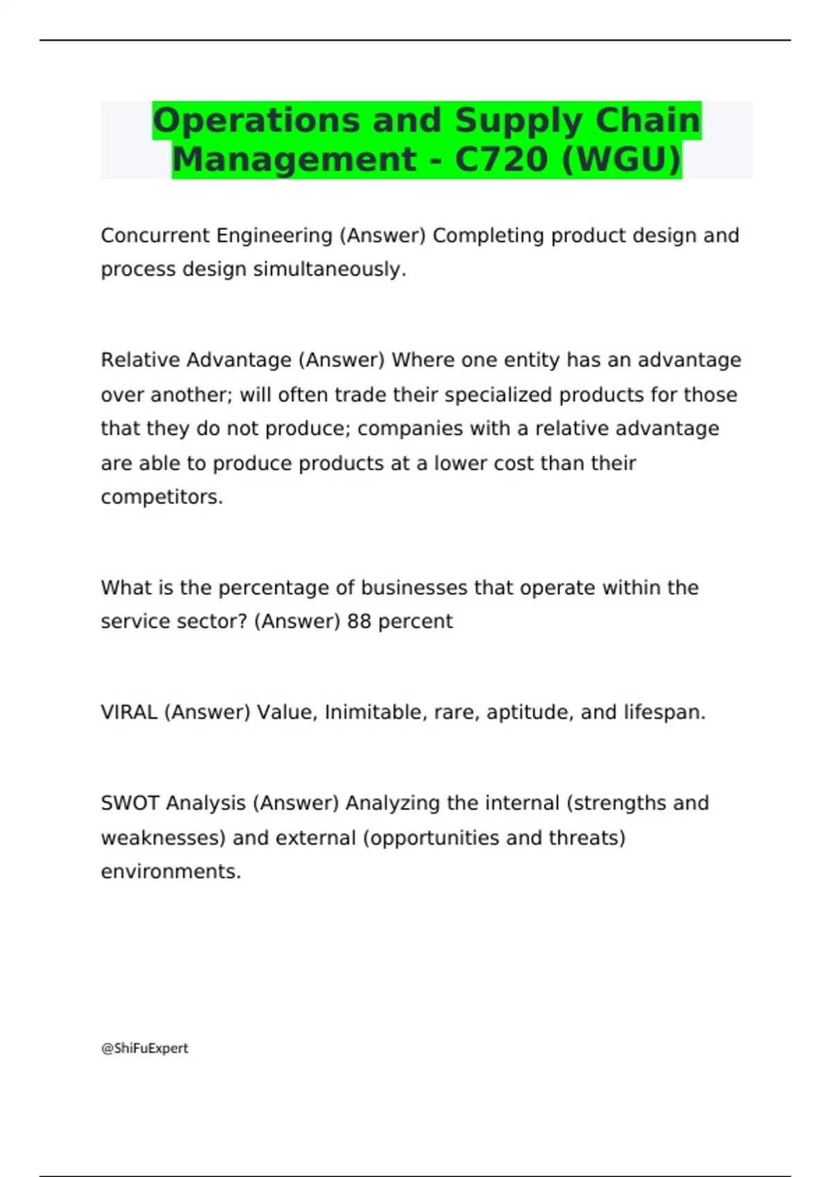 Operations and Supply Chain Management - C720 (WGU) Concurrent Engineering (Answer) Completing product design and process design simultaneously. Relative Advantage (Answer) Where one entity has an advantage over another; will often trade their specialized products for those that they do not produce; companies with a relative advantage are able to produce products at a lower cost than their competitors. What is the percentage of businesses that operate within the service sector? (Answer) 88 percent VIRAL (Answer) Value, Inimitable, rare, aptitude, and lifespan. SWOT Analysis (Answer) Analyzing the internal (strengths and weaknesses) and external (opportunities and threats) environments. Requirements for developing competitive advantage (Answer) SWOT, business process, competitive capabilities, and customer requirements. Matching (Answer) Matching strengths to opportunities. Converting (Answer) Converting weaknesses or threats into strengths or opportunities.