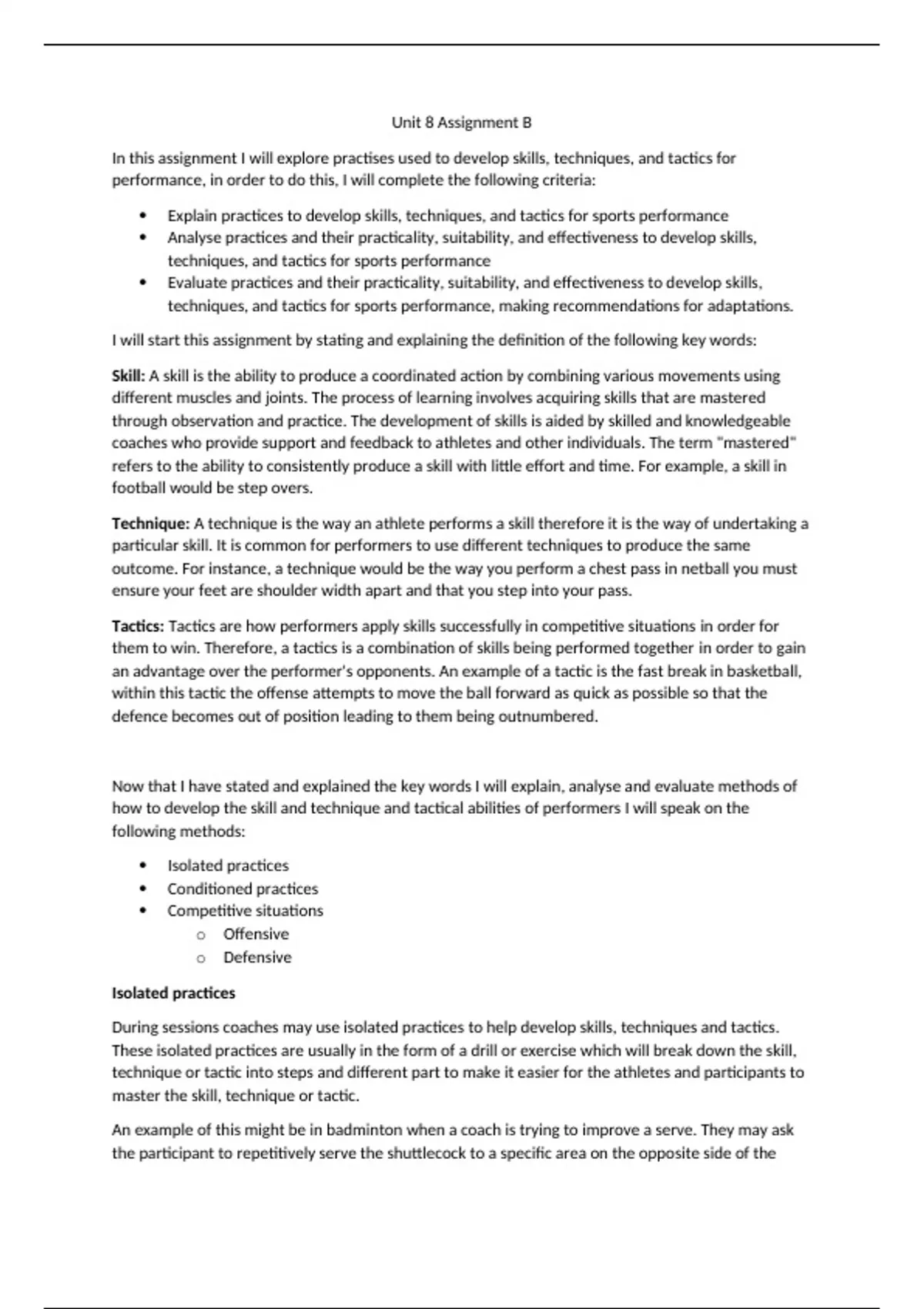In this assignment I will explore practises used to develop skills, techniques, and tactics for