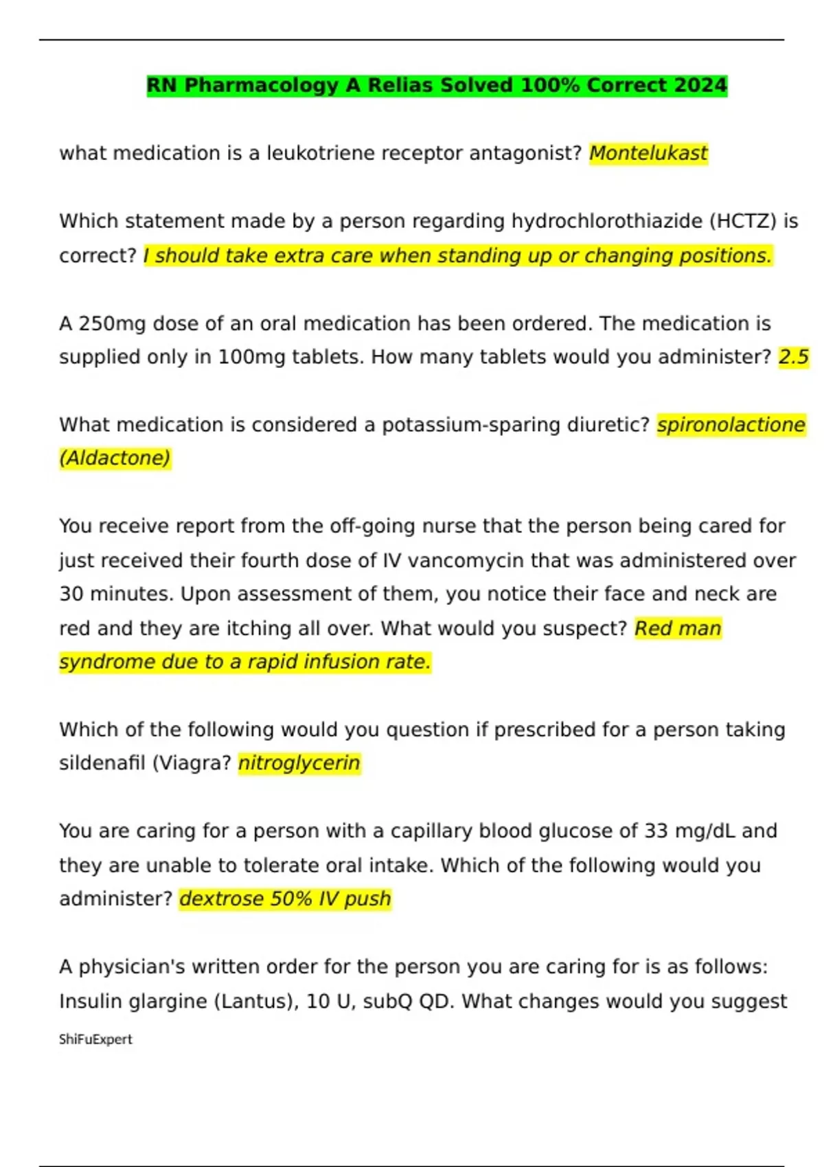 RN Pharmacology A Relias Solved 100% Correct 2024 what medication is a leukotriene receptor antagonist? Montelukast Which statement made by a person regarding hydrochlorothiazide (HCTZ) is correct? I should take extra care when standing up or changing positions. A 250mg dose of an oral medication has been ordered. The medication is supplied only in 100mg tablets. How many tablets would you administer? 2.5 What medication is considered a potassium-sparing diuretic? spironolactione (Aldactone) You receive report from the off-going nurse that the person being cared for just received their fourth dose of IV vancomycin that was administered over 30 minutes. Upon assessment of them, you notice their face and neck are red and they are itching all over. What would you suspect? Red man syndrome due to a rapid infusion rate. Which of the following would you question if prescribed for a person taking sildenafil (Viagra? nitroglycerin You are caring for a person with a capillary blood glucose of 33 mg/dL and they are unable to tolerate oral intake. Which of the following would you administer? dextrose 50% IV push A physician's written order for the person you are caring for is as follows: Insulin glargine (Lantus), 10 U, subQ QD. What changes would you suggest for safety and to avoid the use of "do not use" abbreviations? spell out units and daily Which statement, if made by the person you are caring for, reflects the need for further education regarding a new prescriptions of warfarin (Coumadin)? If I get headaches, aspirin is my best options for pain A person is noted to have a penicillin allergy. What medication would you question of ordered by a physician? ceftriaxone