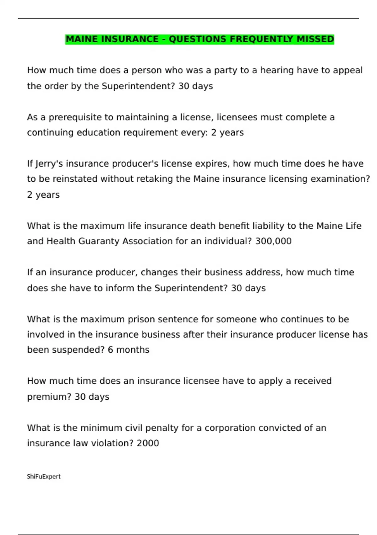 Maine Insurance - Questions Frequently Missed