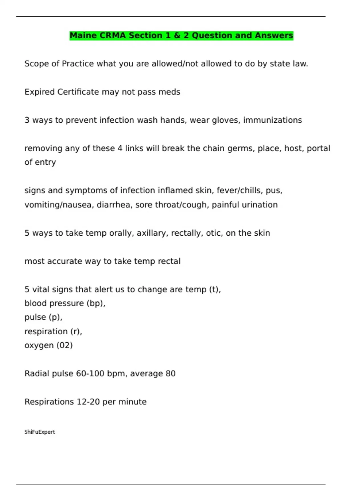 Maine CRMA Section 1 & 2 Question and Answers Scope of Practice what you are allowed/not allowed to do by state law. Expired Certificate may not pass meds 3 ways to prevent infection wash hands, wear gloves, immunizations removing any of these 4 links will break the chain germs, place, host, portal of entry signs and symptoms of infection inflamed skin, fever/chills, pus, vomiting/nausea, diarrhea, sore throat/cough, painful urination 5 ways to take temp orally, axillary, rectally, otic, on the skin most accurate way to take temp rectal 5 vital signs that alert us to change are temp (t), blood pressure (bp), pulse (p), respiration (r), oxygen (02) Radial pulse 60-100 bpm, average 80 Respirations 12-20 per minute What is needed to take vital signs: A bp cuff, stethoscope, thermometer, Timer List 2 locations for taking a pulse radial (thumb side of persons wrist, apical (stethoscope, mid nipple of left chest) when is a good time to monitor respirations when the person is unaware (because they might altar their breathing) What 2 pressures are measured when taking blood pressure Systolic, Diastolic What does crma stand for? Certified Residential Medication Aide Psychopathic meds are good for how long 3 mo. or 90 days Narcotics are good for how long 1 mo. or 30 days 4 ways to take a pulse radial (wrist), brachial (elbow), carotid (neck), apical (chest) Who can accept telephone orders? rn or pharmacist What are Schedule 2 meds? Controlled substances. Need to be counted and signed once a day if used. Once per shift. Once a week if not used. To destroy, there must be 2 people present.