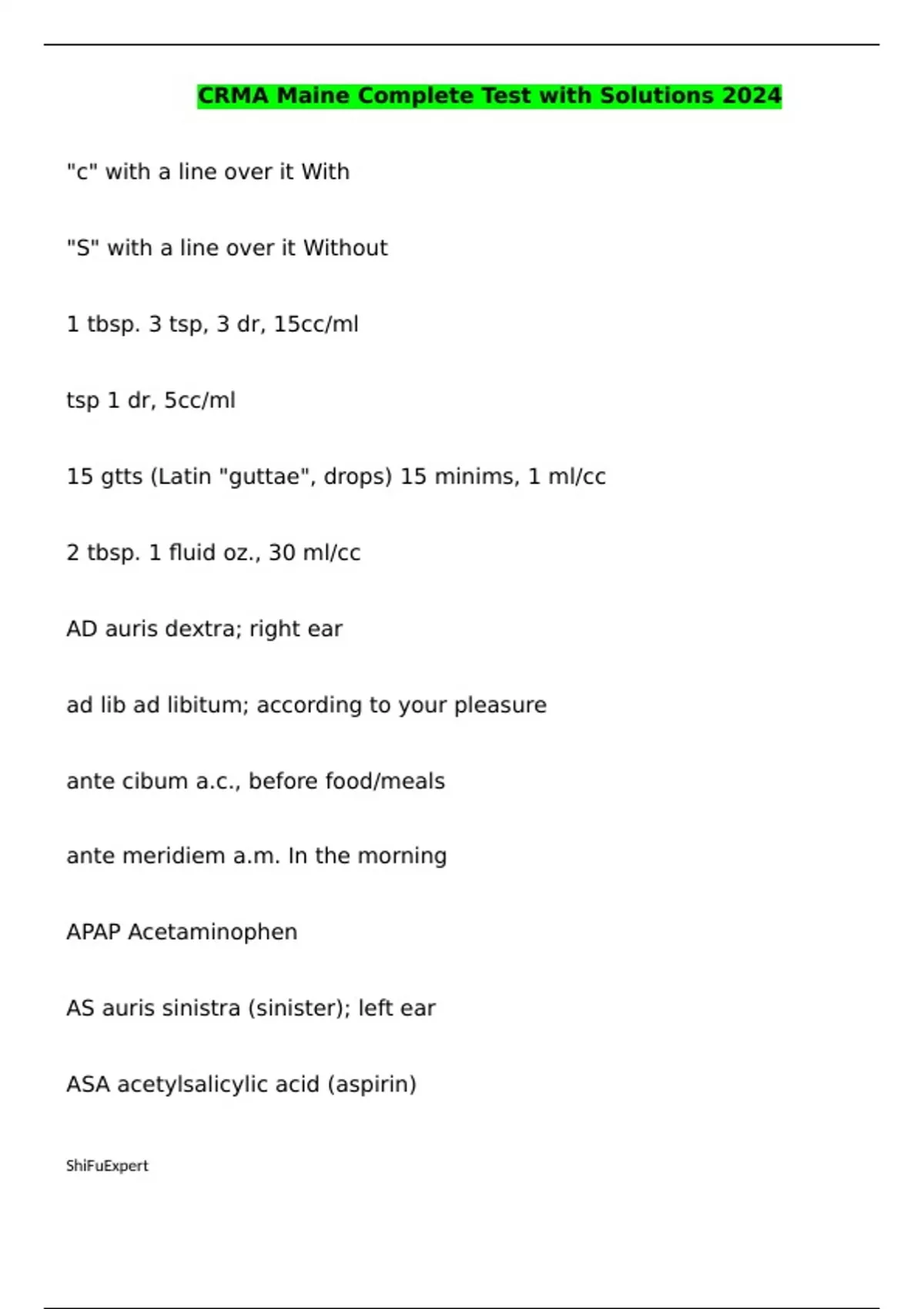 CRMA Maine Complete Test with Solutions 2024 "c" with a line over it With "S" with a line over it Without 1 tbsp. 3 tsp, 3 dr, 15cc/ml tsp 1 dr, 5cc/ml 15 gtts (Latin "guttae", drops) 15 minims, 1 ml/cc 2 tbsp. 1 fluid oz., 30 ml/cc AD auris dextra; right ear ad lib ad libitum; according to your pleasure ante cibum a.c., before food/meals ante meridiem a.m. In the morning APAP Acetaminophen AS auris sinistra (sinister); left ear ASA acetylsalicylic acid (aspirin) AU aures utrae; each ear (of both) b.i.d. or BID bis in die; twice (times) per day BM bowel movement BP blood pressure c/o complaint of Ca Calcium cafe au lait spot This is a skin lesion that is the color of coffee with milk—a distinctive light brown pigment having a macular form. Pronounced "kahFAY o LAY."