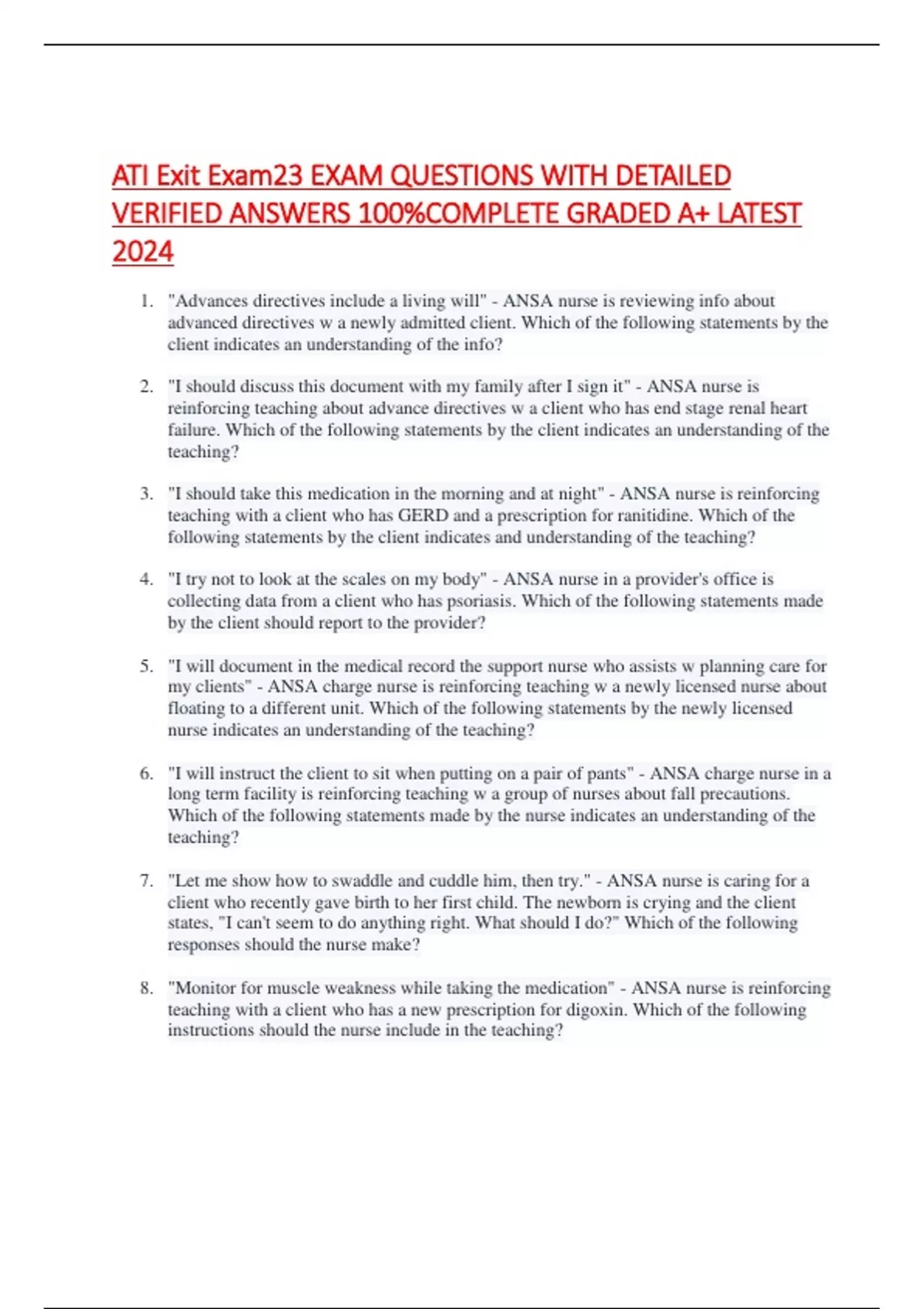 ATI Exit Exam23 EXAM QUESTIONS WITH DETAILED VERIFIED ANSWERS 100%COMPLETE GRADED A+ LATEST 2024 1. "Advances directives include a living will" - ANSA nurse is reviewing info about advanced directives w a newly admitted client. Which of the following statements by the client indicates an understanding of the info? 2. "I should discuss this document with my family after I sign it" - ANSA nurse is reinforcing teaching about advance directives w a client who has end stage renal heart failure. Which of the following statements by the client indicates an understanding of the teaching? 3. "I should take this medication in the morning and at night" - ANSA nurse is reinforcing teaching with a client who has GERD and a prescription for ranitidine. Which of the following statements by the client indicates and understanding of the teaching? 4. "I try not to look at the scales on my body" - ANSA nurse in a provider's office is collecting data from a client who has psoriasis. Which of the following statements made by the client should report to the provider? 5. "I will document in the medical record the support nurse who assists w planning care for my clients" - ANSA charge nurse is reinforcing teaching w a newly licensed nurse about floating to a different unit. Which of the following statements by the newly licensed nurse indicates an understanding of the teaching? 6. "I will instruct the client to sit when putting on a pair of pants" - ANSA charge nurse in a long term facility is reinforcing teaching w a group of nurses about fall precautions. Which of the following statements made by the nurse indicates an understanding of the teaching? 7. "Let me show how to swaddle and cuddle him, then try." - ANSA nurse is caring for a client who recently gave birth to her first child. The newborn is crying and the client states, "I can't seem to do anything right. W