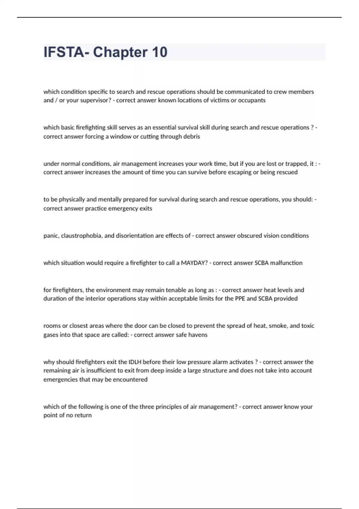 IFSTA- Chapter 10which condition specific to search and rescue operations should be communicated to crew members and / or your supervisor? - correct answer known locations of victims or occupants which basic firefighting skill serves as an essential survival skill during search and rescue operations ? - correct answer forcing a window or cutting through debris under normal conditions, air management increases your work time, but if you are lost or trapped, it : - correct answer increases the amount of time you can survive before escaping or being rescued to be physically and mentally prepared for survival during search and rescue operations, you should: - correct answer practice emergency exits panic, claustrophobia, and disorientation are effects of - correct answer obscured vision conditions which situation would require a firefighter to call a MAYDAY? - correct answer SCBA malfunction for firefighters, the environment may remain tenable as long as : - correct answer heat levels and duration of the interior operations stay within acceptable limits for the PPE and SCBA provided rooms or closest areas where the door can be closed to prevent the spread of heat, smoke, and toxic gases into that space are called: - correct answer safe havens why should firefighters exit the IDLH before their low pressure alarm activates ? - correct answer the remaining air is insufficient to exit from deep inside a large structure and does not take into account emergencies that may be encountered which of the following is one of the three principles of air management? - correct answer know your point of no return