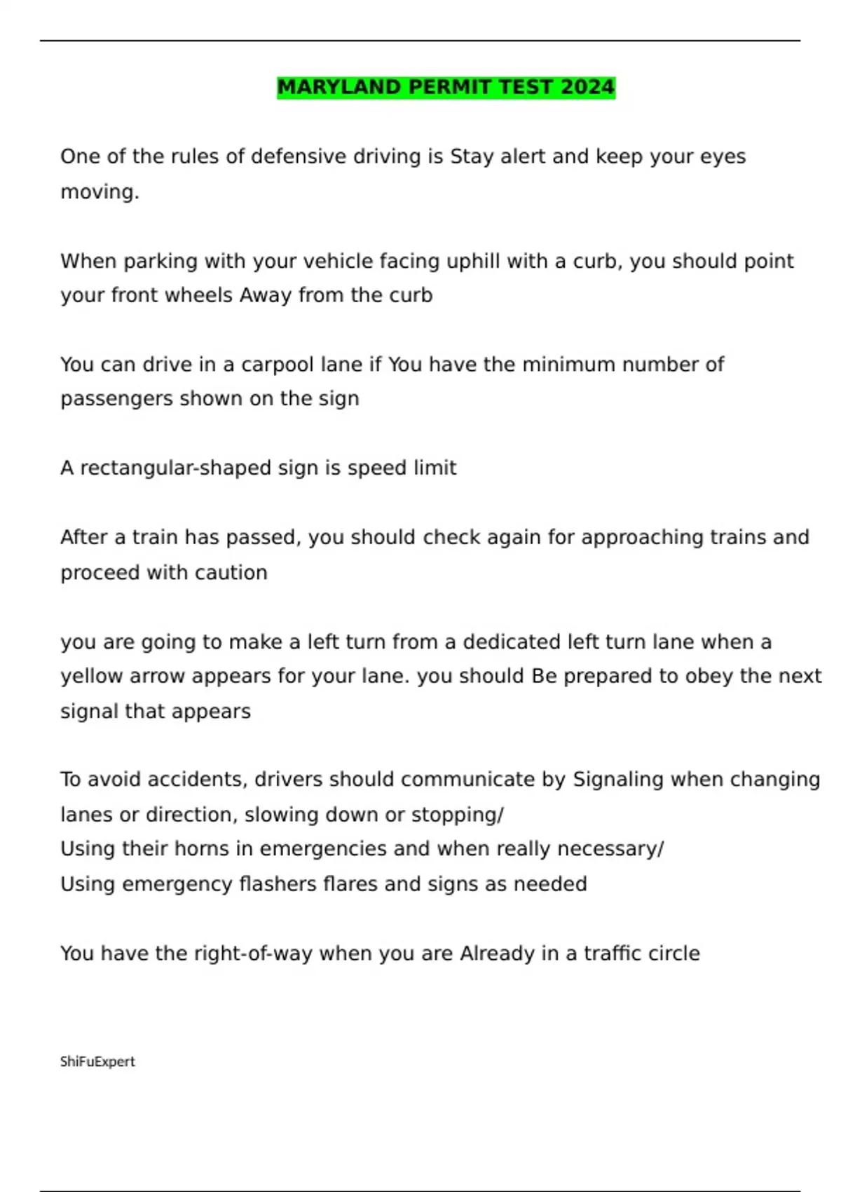 MARYLAND PERMIT TEST 2024 One of the rules of defensive driving is Stay alert and keep your eyes moving. When parking with your vehicle facing uphill with a curb, you should point your front wheels Away from the curb You can drive in a carpool lane if You have the minimum number of passengers shown on the sign A rectangular-shaped sign is speed limit After a train has passed, you should check again for approaching trains and proceed with caution you are going to make a left turn from a dedicated left turn lane when a yellow arrow appears for your lane. you should Be prepared to obey the next signal that appears To avoid accidents, drivers should communicate by Signaling when changing lanes or direction, slowing down or stopping/ Using their horns in emergencies and when really necessary/ Using emergency flashers flares and signs as needed You have the right-of-way when you are Already in a traffic circle What kinds of drugs, other than alcohol, can affect your driving ability allergy medicine, marijuana, cold remedy Seat belts can be most effective as injury preventive devices when they are worn by Passengers and the driver whenever they are in the car
