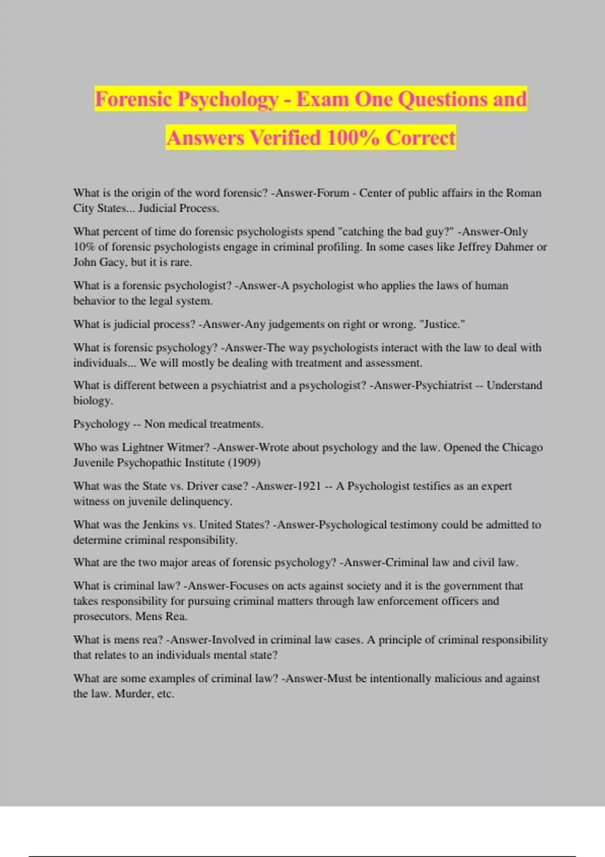 Forensic Psychology - Exam One Questions and Answers Verified 100% Correct What is the origin of the word forensic? -Answer-Forum - Center of public affairs in the Roman City States... Judicial Process. What percent of time do forensic psychologists spend "catching the bad guy?" -Answer-Only 10% of forensic psychologists engage in criminal profiling. In some cases like Jeffrey Dahmer or John Gacy, but it is rare. What is a forensic psychologist? -Answer-A psychologist who applies the laws of human behavior to the legal system. What is judicial process? -Answer-Any judgements on right or wrong. "Justice." What is forensic psychology? -Answer-The way psychologists interact with the law to deal with individuals... We will mostly be dealing with treatment and assessment. What is different between a psychiatrist and a psychologist? -Answer-Psychiatrist -- Understand biology. Psychology -- Non medical treatments. Who was Lightner Witmer? -Answer-Wrote about psychology and the law. Opened the Chicago Juvenile Psychopathic Institute (1909) What was the State vs. Driver case? -Answer-1921 -- A Psychologist testifies as an expert witness on juvenile delinquency. What was the Jenkins vs. United States? -Answer-Psychological testimony could be admitted to determine criminal responsibility. What are the two major areas of forensic psychology? -Answer-Criminal law and civil law. What is criminal law? -Answer-Focuses on acts against society and it is the government that takes responsibility for pursuing criminal matters through law enforcement officers and prosecutors. Mens Rea. What is mens rea? -Answer-Involved in criminal law cases. A principle of criminal responsibility that relates to an individuals mental state? What are some examples of criminal law? -Answer-Must be intentionally malicious and against the law. Murder, etc. What would a forensic psychologist do in a criminal law case? -Answer-Risk assessment, rules of insanity, competency to stand trial, treatment of sexual offenders, and juvenile transfer to adult court. What is civil law? -Answer-Violations include any