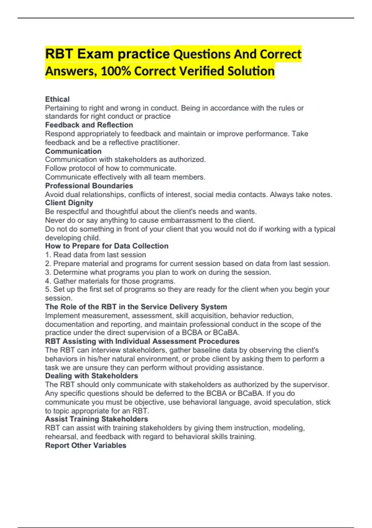 RBT Exam practice Questions And Correct Answers, 100% Correct Verified Solution Ethical Pertaining to right and wrong in conduct. Being in accordance with the rules or standards for right conduct or practice Feedback and Reflection Respond appropriately to feedback and maintain or improve performance. Take feedback and be a reflective practitioner. Communication Communication with stakeholders as authorized. Follow protocol of how to communicate. Communicate effectively with all team members. Professional Boundaries Avoid dual relationships, conflicts of interest, social media contacts. Always take notes. Client Dignity Be respectful and thoughtful about the client's needs and wants. Never do or say anything to cause embarrassment to the client. Do not do something in front of your client that you would not do if working with a typical developing child. How to Prepare for Data Collection 1. Read data from last session 2. Prepare material and programs for current session based on data from last session. 3. Determine what programs you plan to work on during the session. 4. Gather materials for those programs. 5. Set up the first set of programs so they are ready for the client when you begin your session. The Role of the RBT in the Service Delivery System Implement measurement, assessment, skill acquisition, behavior reduction, documentation and reporting, and maintain professional conduct in the scope of the practice under the direct supervision of a BCBA or BCaBA. RBT Assisting with Individual Assessment Procedures The RBT can interview stakeholders, gather baseline data by observing the client's behaviors in his/her natural environment, or probe client by asking them to perform a task we are unsure they can perform without providing assistance. Dealing with Stakeholders The RBT should only communicate with stakeholders as authorized by the supervisor. Any specific questions should be deferred to the BCBA or BCaBA. If you do communicate you must be objective, use behavioral language, avoid speculation, stick to topic appropriate for an RBT. Assist Training Stakeholders RBT can assist with training stakeholders by giving them instruction, modeling, rehearsal, and feedback with regard to behavioral skills training. Report Other Variables illness, relocation or change in medication. Components of a Written Behavior Plan 1. Identify, describe, create a goal for a behavior in observable terms. 2. Assess antecedent/consequence that may maintain behavior. 3. Identify hypothesis of function of behavior. 4. Identify possible replacement behaviors. 5. Select and implement antecedent/consequence based interventions. 6. Create crisis intervention plan. 7. Implementation, modification, generalization and maintenance procedures. Skill Acquisition Plan 7 Components 1. Identify the skill deficit 2. Create a goal to address the deficit 3. Establish a data measurement system 4. Take baseline data (Assess current skill level) 5. Select and implement an acquisition procedure. 6. Collect data to assess effectiveness of the procedure. 7. Modify existing plan based on assessment data. (Modify, if necessary) to maintain/increase effectiveness) Prepare for Skill Acquisition Plan 1. Determine what occurred last session to decide where to start. 2. Select skill acquisition procedures to complete during session. 3. Prepare materials you will need for the skill acquisition (including data collection protocols). 5 Dimensions we can Shape 1. Topography 2. Frequency 3. Latency 4. Duration 5. Amplitude/Intensity Applied Behavior Analysis The science in which tactics derived from the principles of behavior are applied systematically to improve socially significant behavior and experimentation is used to identify the variables responsible for behavior change. The scientific study of principles of learning and behavior. Behavior An activity of living organisms. What an individual does (how they respond in the situation). It is observable and measurable. Response Specific instance of behavior. 4 types of Responses: 1. Correct 2. Incorrect 3. Non-Response 4. Prompted Respondent Behavior Untaught or unconditioned responses. Reflex. Respondent Conditioning New stimuli can acquire the ability to elicit responses. Occurs through pairing of two stimuli. Stimulus - Stimulus Pairing (S - S) Unconditioned Stimulus A stimulus that elicits an unconditioned response. i.e. Food is an unconditioned stimulus for a hungry animal and salivation is the unconditioned response. Unconditioned Response A behavior that occurs naturally due to a given stimulus. i.e. Dogs salivating in the presence of food; yelping upon being bitten by an insect. Conditioned Stimulus A previously neutral stimulus that, after repeated association with an unconditioned stimulus, elicits the response produced by the unconditioned stimulus itself. Conditioned Response A behavior that does not come naturally, but must be learned by the individual by pairing a neutral stimulus with an unconditioned stimulus. Unconditioned Reinforcers (AKA primary reinforcers) Stimuli that do not require learning. (i.e. food, water, warmth, sleep, sexual stimulation) Conditioned Reinforcers (AKA secondary reinforcers) Neutral stimuli that have been paired with unconditioned reinforcers, or other conditioned reinforcers and through repeated pairing become reinforcers themselves. (i.e. stickers, sound, people) Generalized Conditioned Reinforcers Stimuli that have been paired with a variety of unconditioned and conditioned reinforcers. (i.e. praise, attention, money, tokens) Operant Behavior Behavior that is controlled or influenced by consequences. Behavior whose future frequency is determined by a history of consequences. Operant Conditioning A type of learning where behavior is controlled by consequences. Behavior followed by pleasant consequences tends to be repeated. Behavior followed by unpleasant consequences tends not to be repeated. Mand Training (AKA request training) Training by a